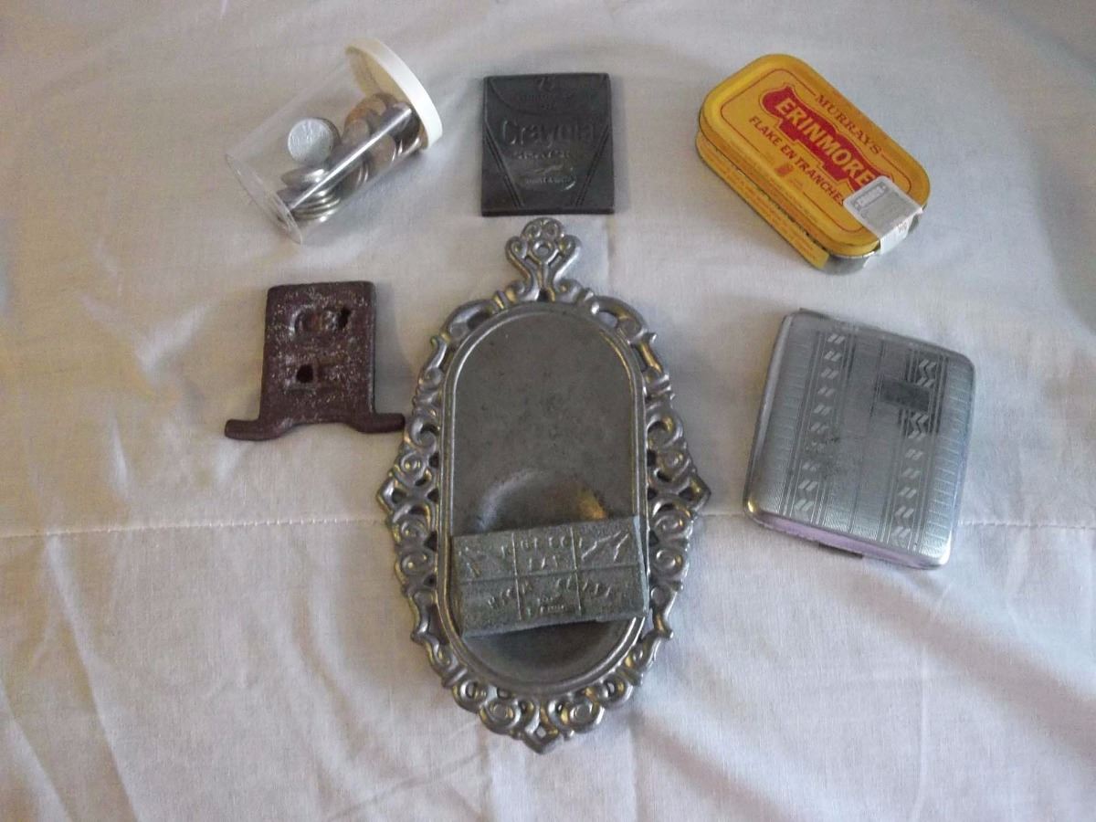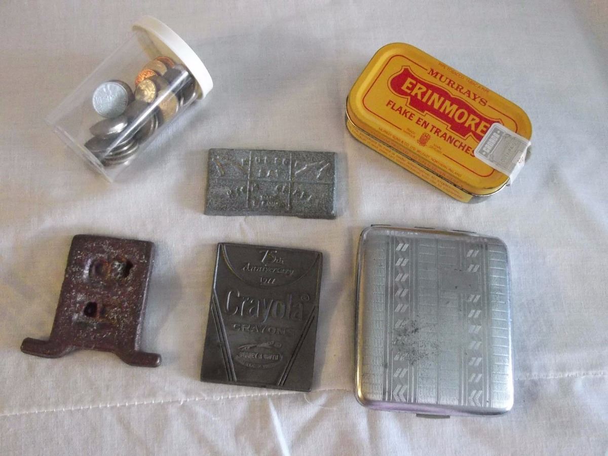 Misc Lot (Old Foreign Coins, Tobacco Tin, Cig Case Hudson Bay Lead, Crayola Commemorative Silver Bro