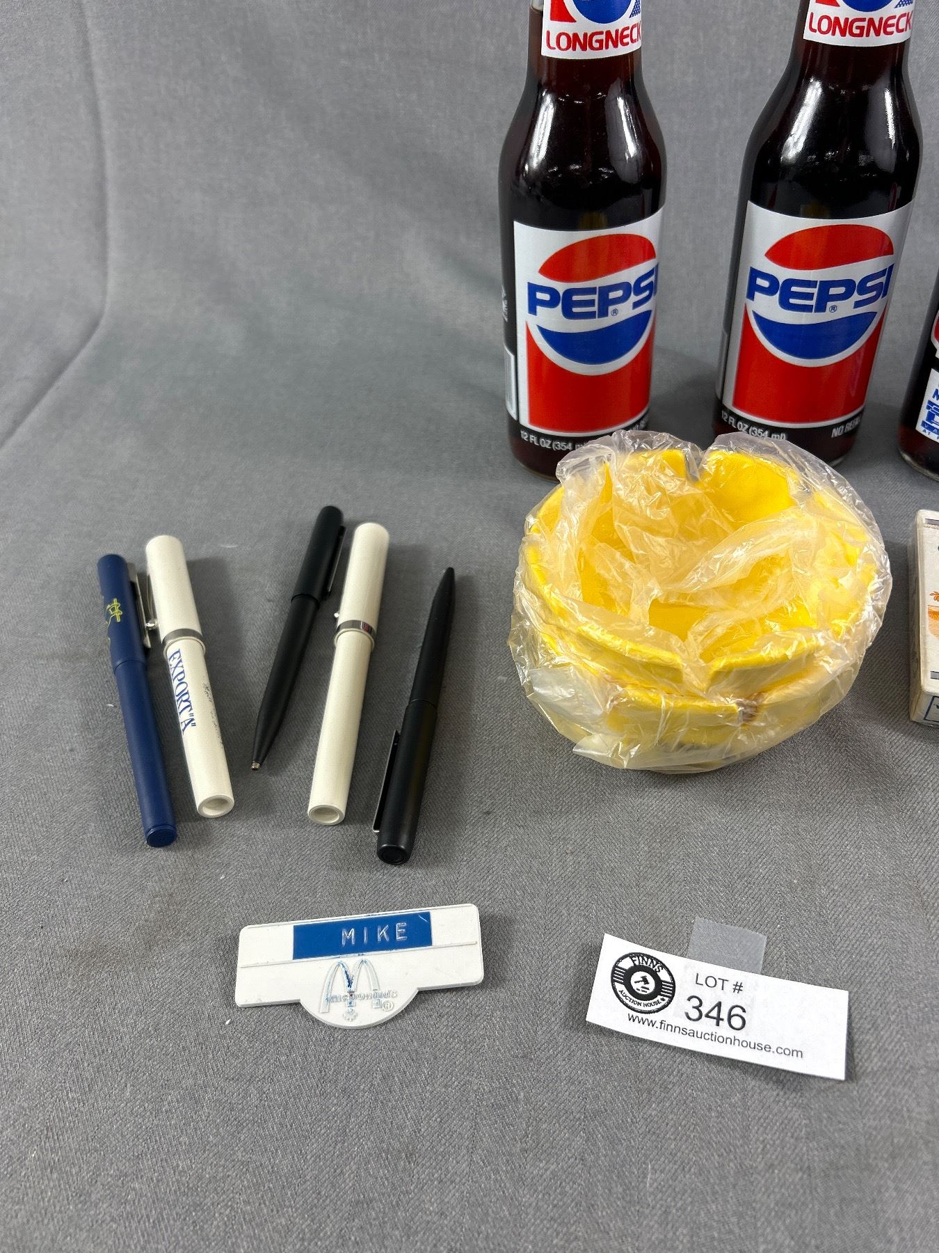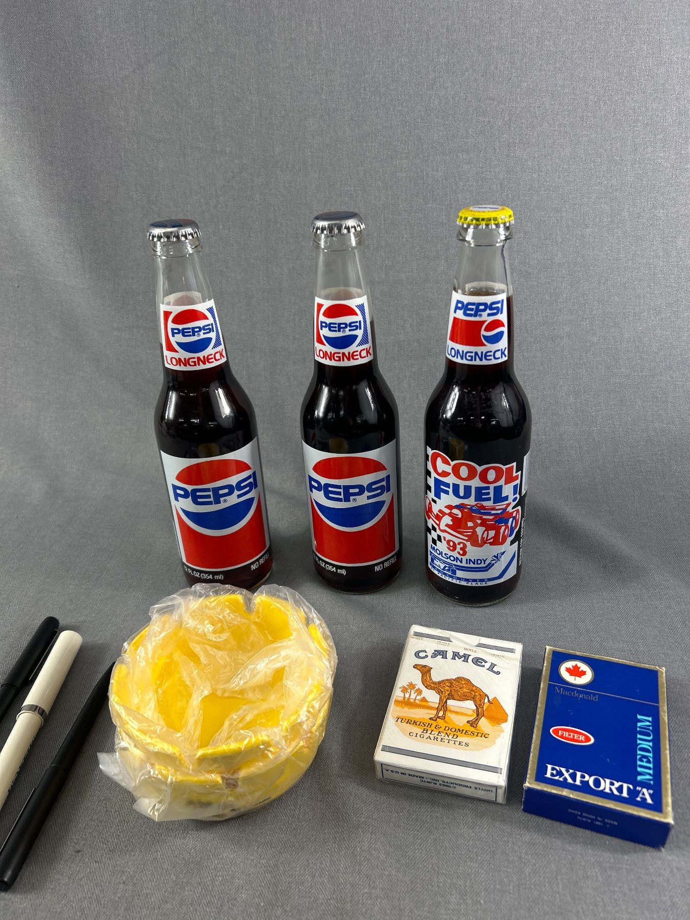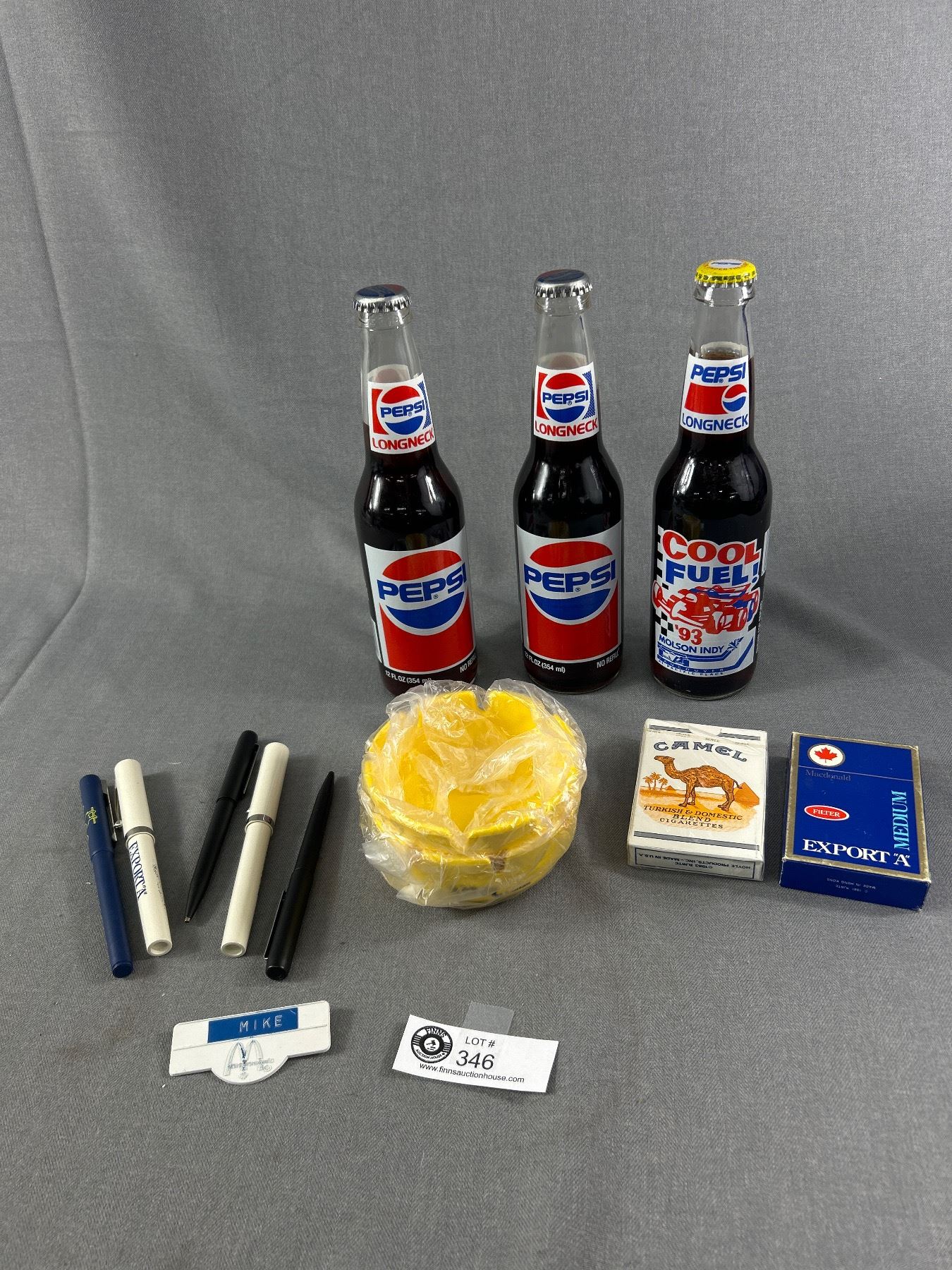 Misc Lot - Playing Cards (Camel & Export A), Pens, Camel Ash Trays & Full Pepsi Cola Bottles