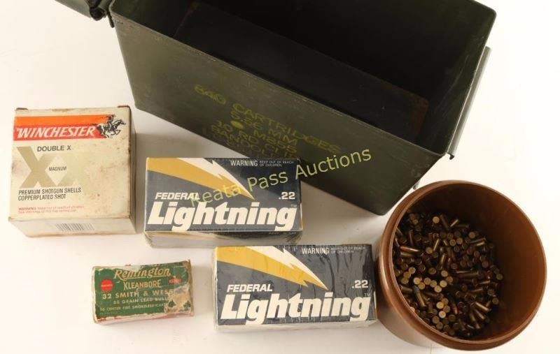 Including; Winchester Double X Magnum 12Ga, Remington Kleanbore 32 S&W, Federal Lightning 22LR, and more all in a green ammo can.
