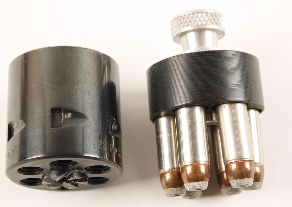 Including a blued non fluted .22 Mag cylinder for a Colt Frontier Scout and a HKS .357 Mag 6 round speed loader. Cylinder is in excellent condition with no dragline.