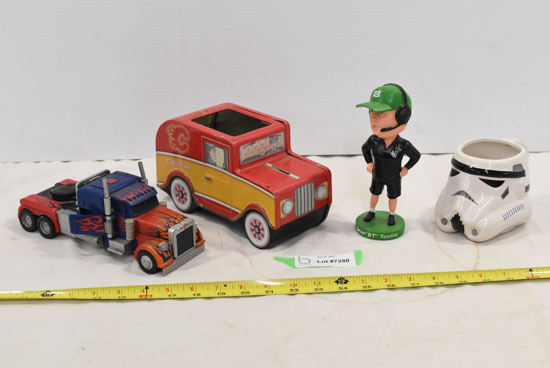 Misc. Lot of Tin Piggy Bank, UofS Coach, Transformer, Storm Trooper Mug