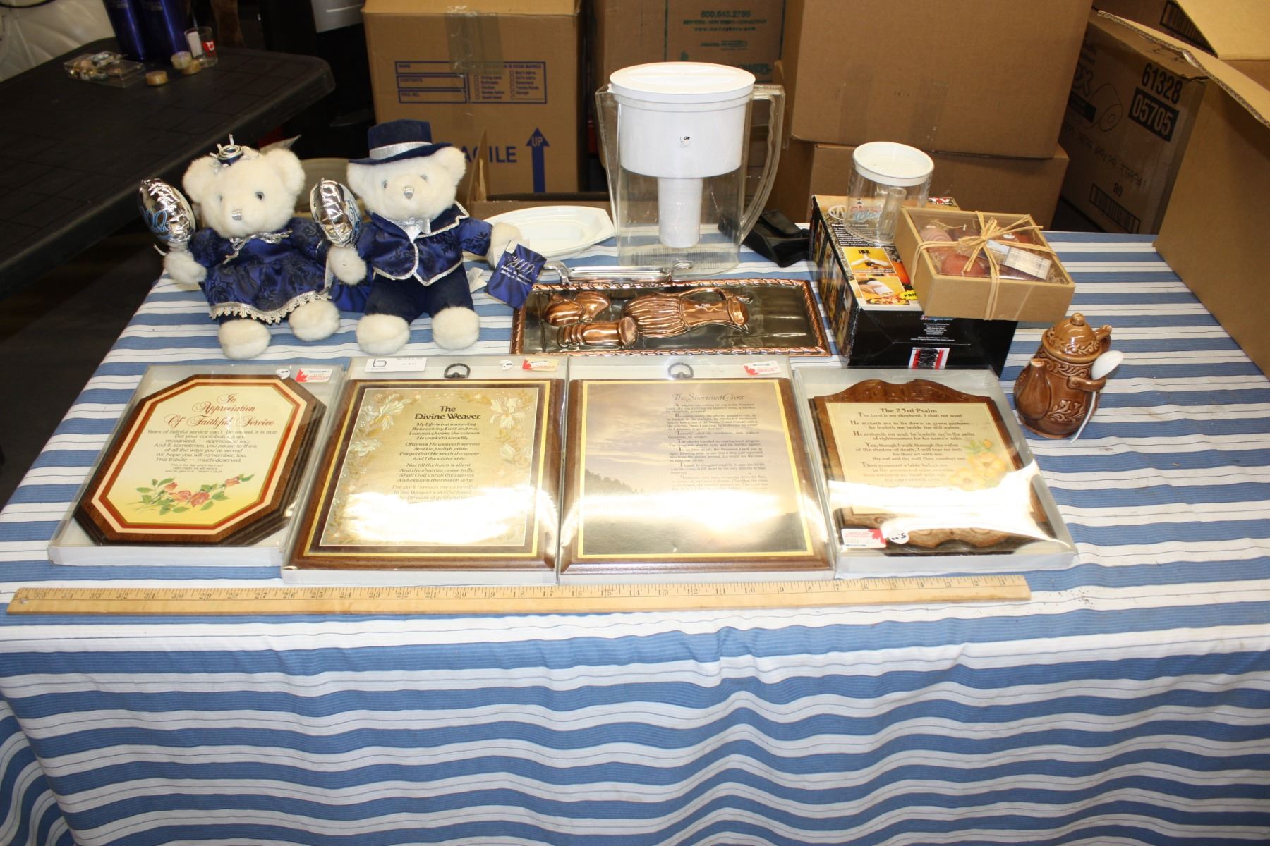 Biblical Displays, Copper Sign, 2 Stuffed bears, and misc kitten items