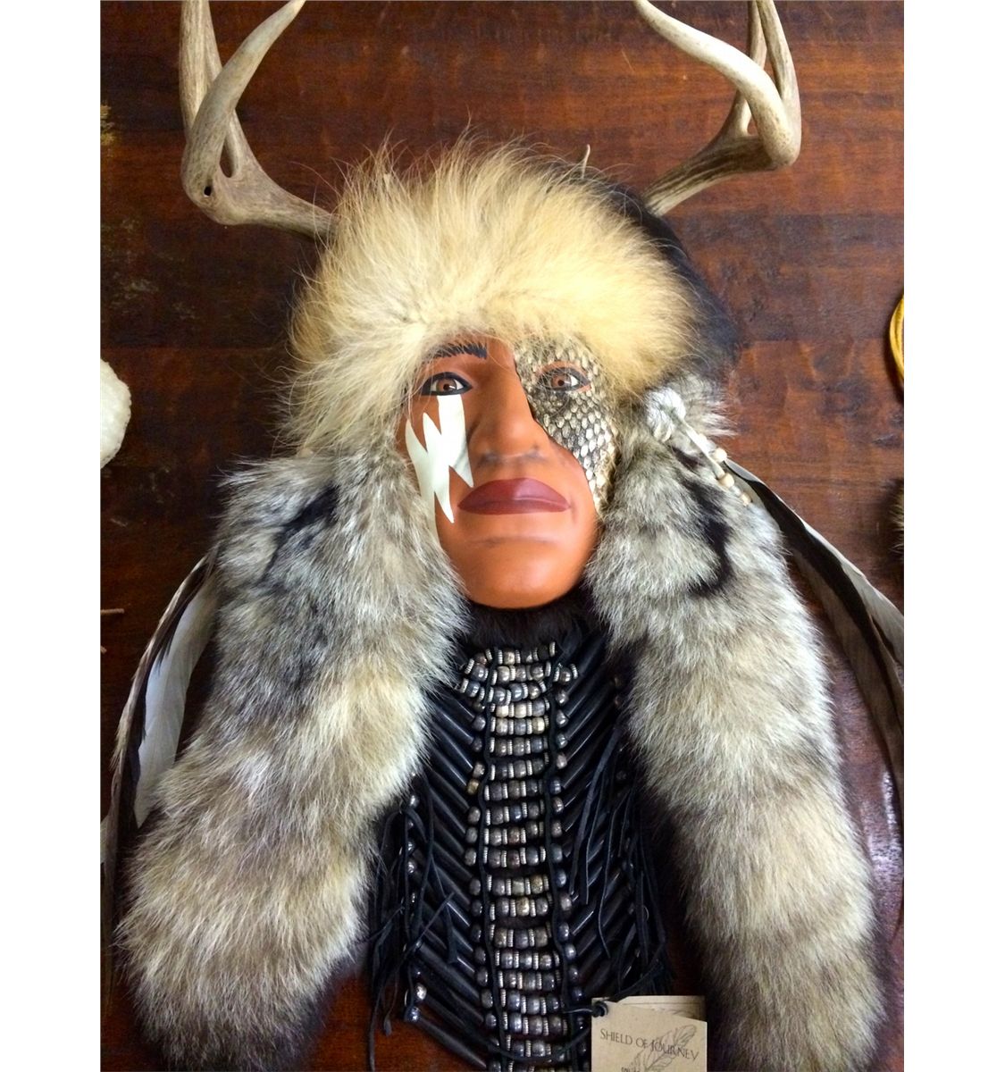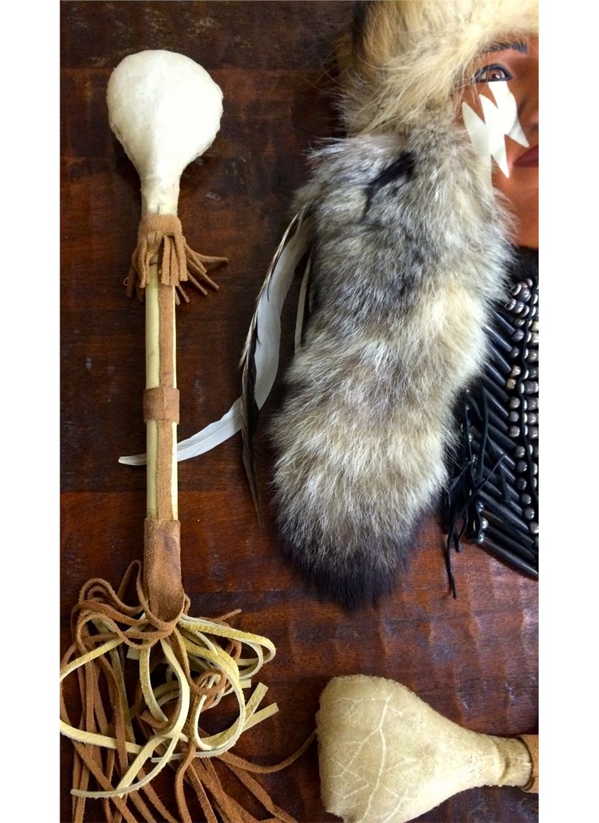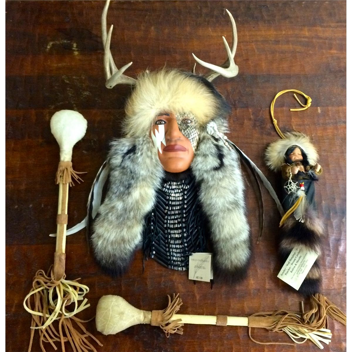 You get four different items for one price in this lot! There are two Native American style rattles, a Native American style wall hanging doll, and a Native American style mask, decked out with deer antlers. ltems state they are made in the USA.