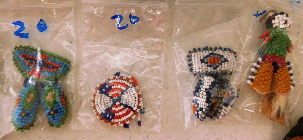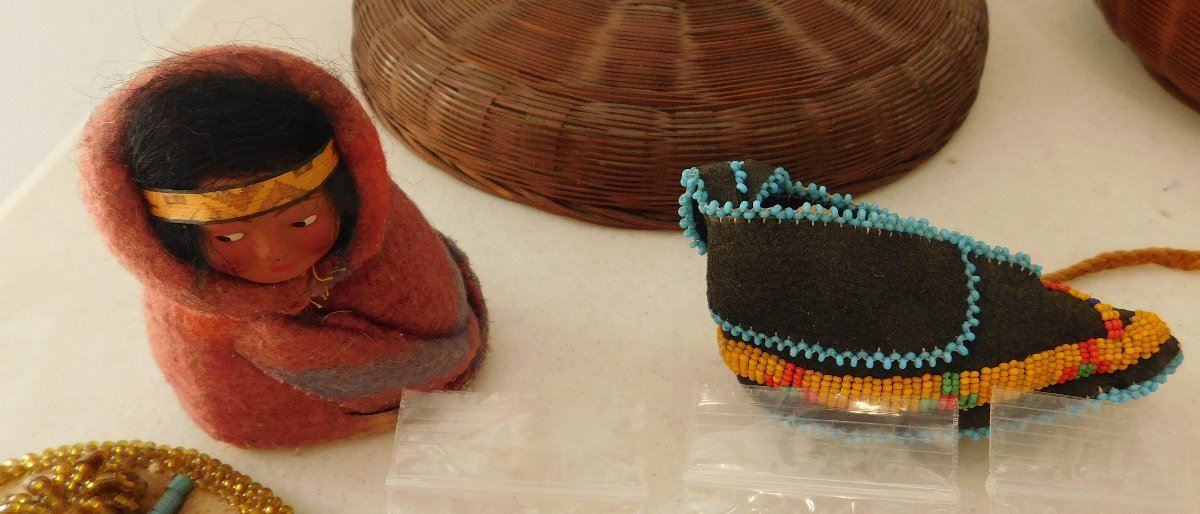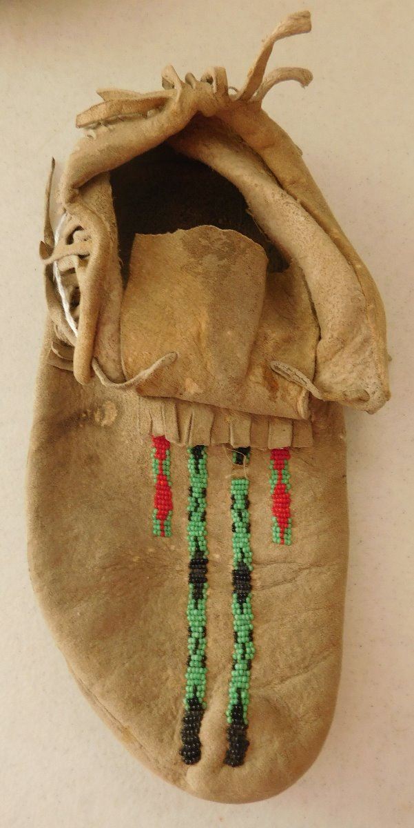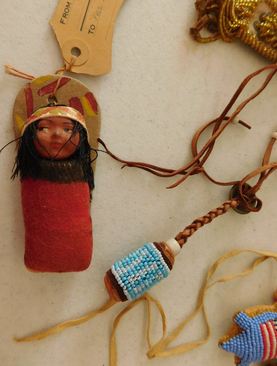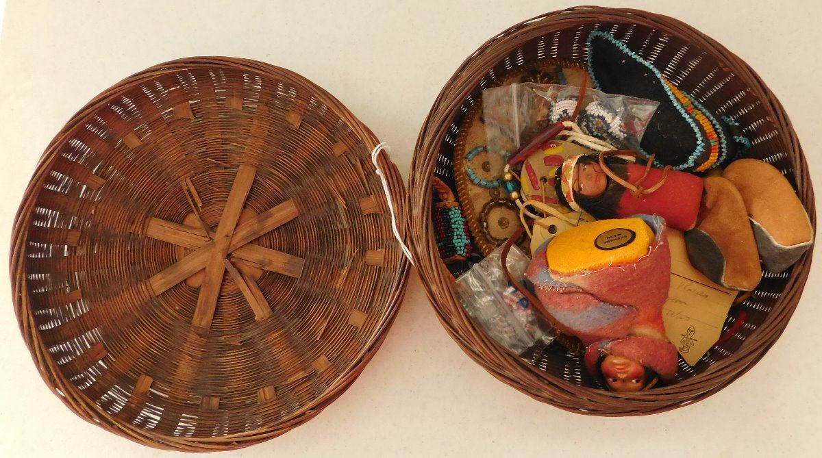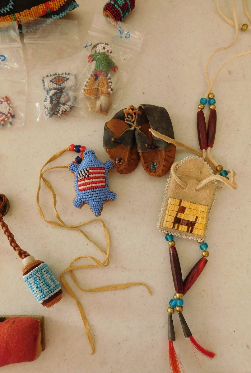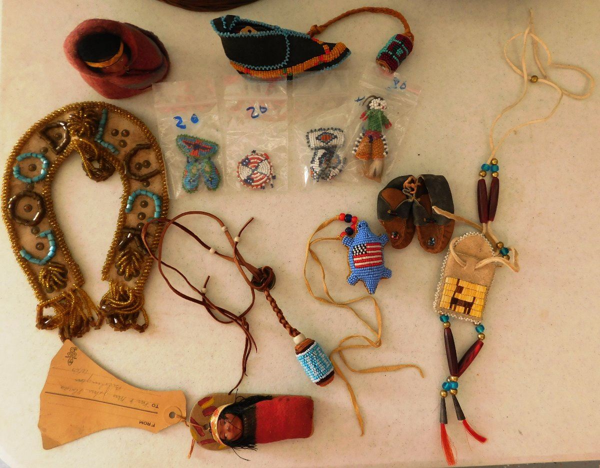 Misc. Old Indian Beadwork, 1890s to 1940s. Made of leather, glass peads and paint, the basket is 9" x 9" x 3.5" and the moccasin is 10" x 5" x 2". Plateau, Plains & Woodland. Many souvenir items, too many items to list! Condition: Mostly good, see images. Shipping: $24.50 w/insurance and signature.