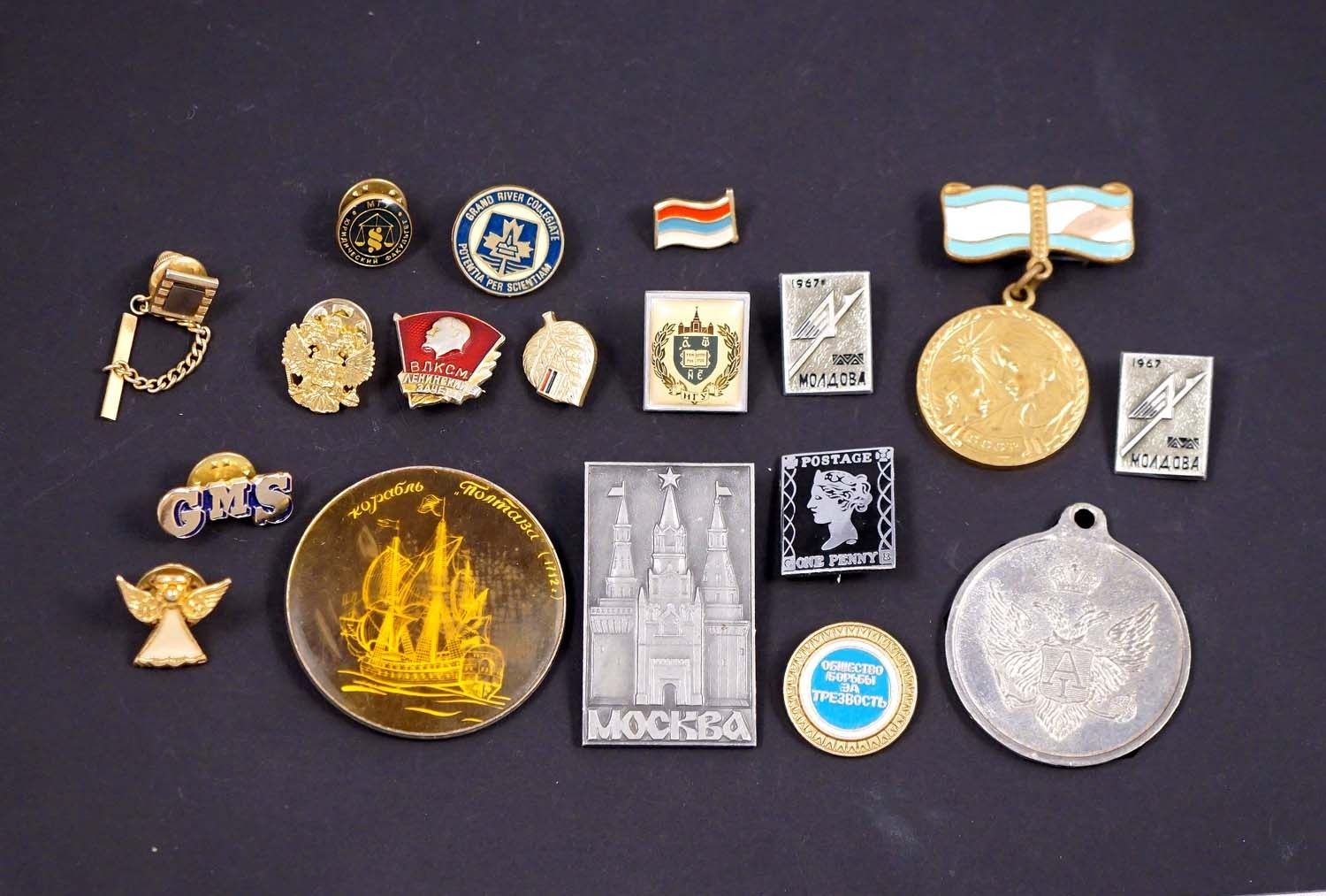 1970's 1/12 Gold Plated "Grapes and Leaves" Pre-owned Pen and 18 Mostly Russian Lapel Pins and medals. Should be viewed.