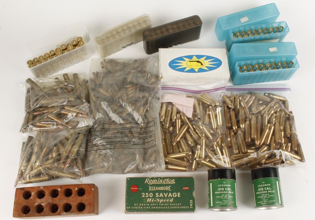 Includes primed 444 super mag ammo approx 120 rounds. Approx 75 count .22 Remington jet brass. 20 rounds of 250 Savage brass and more.