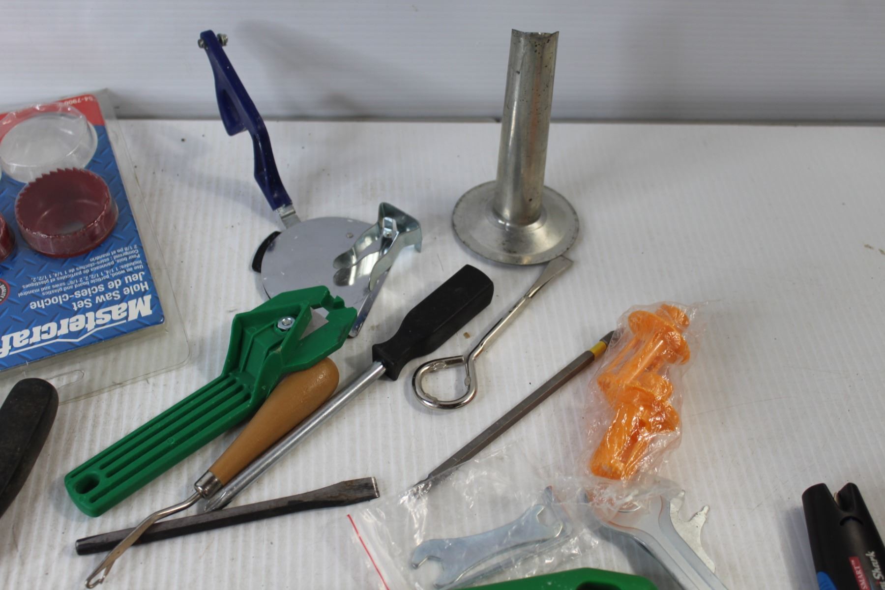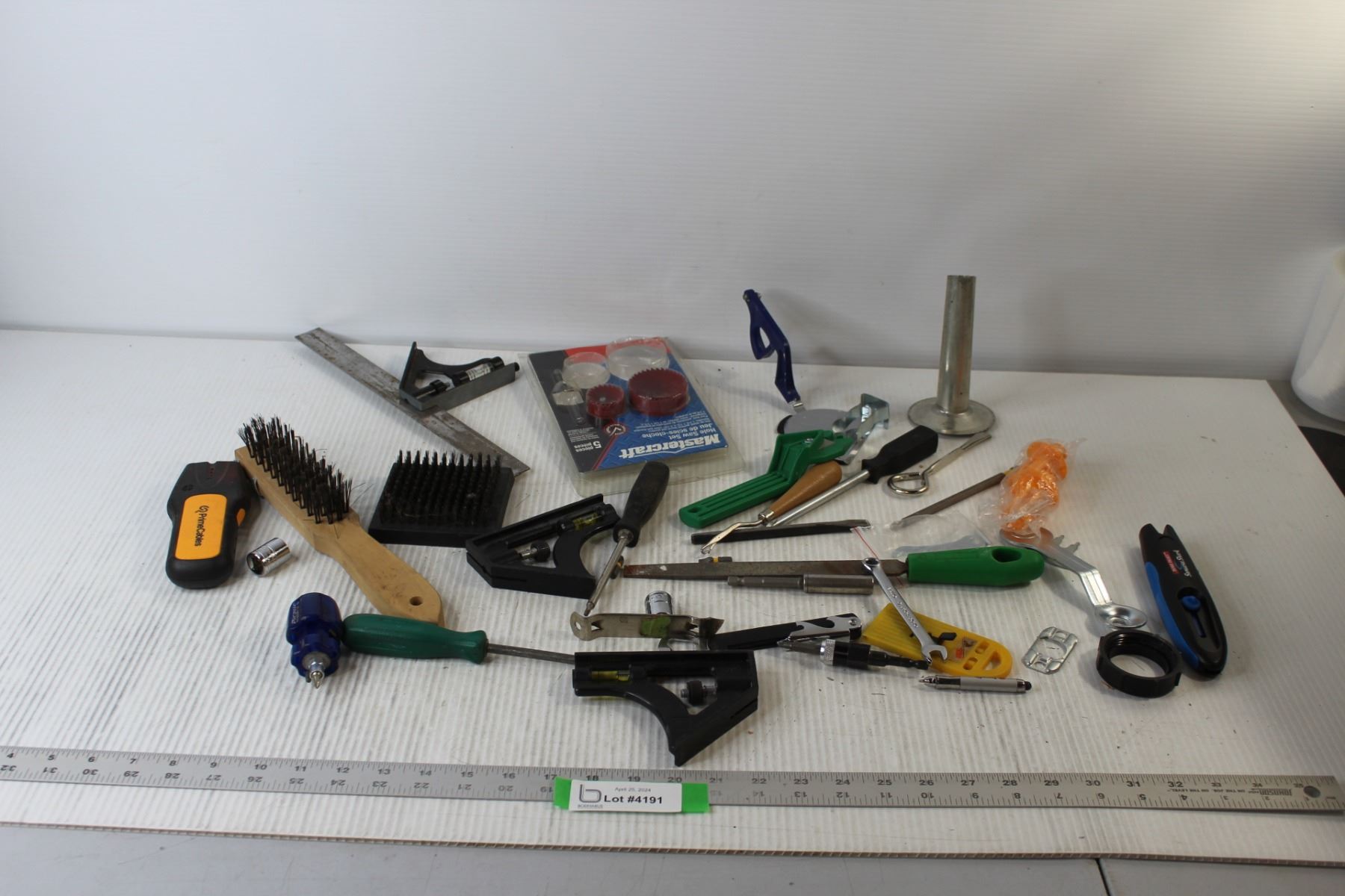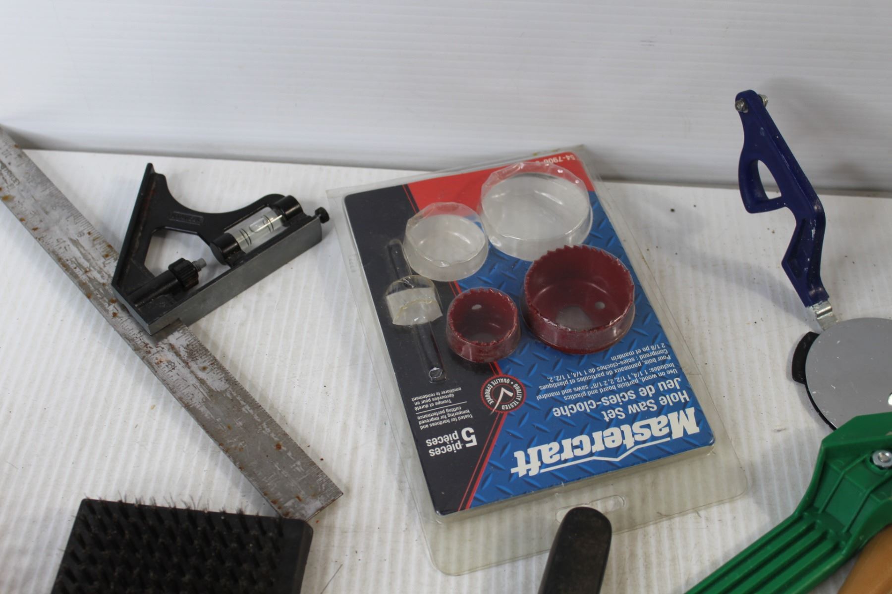 Misc. Shop Tools - File, T Square, Wire Brushes, Wrenches, Sockets, Paint/Can Openers, Partial Hole saw Set, Stud Finder, Screwdrivers etc.