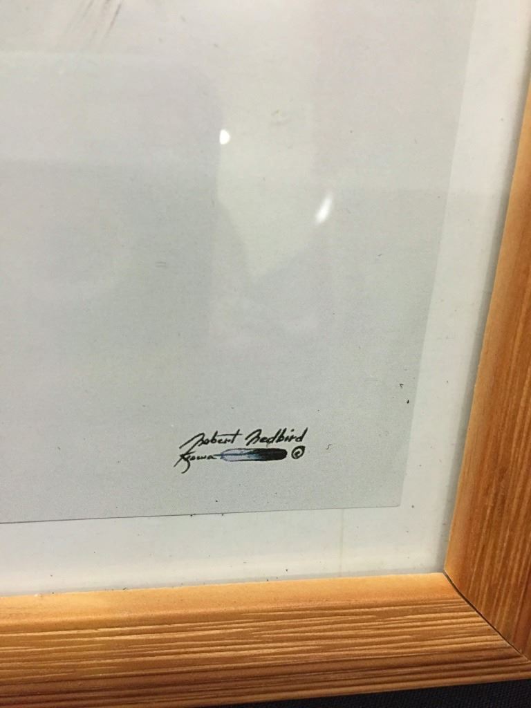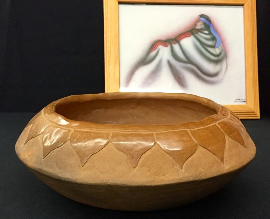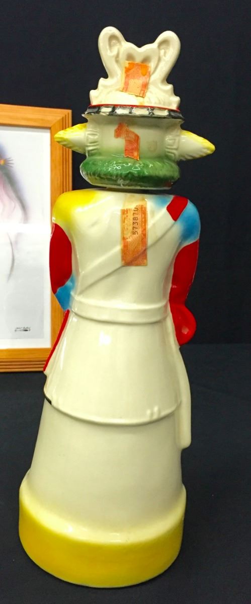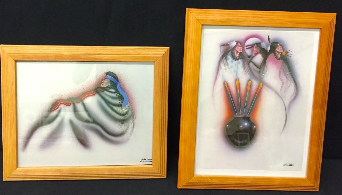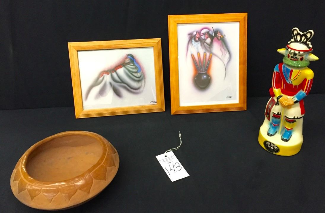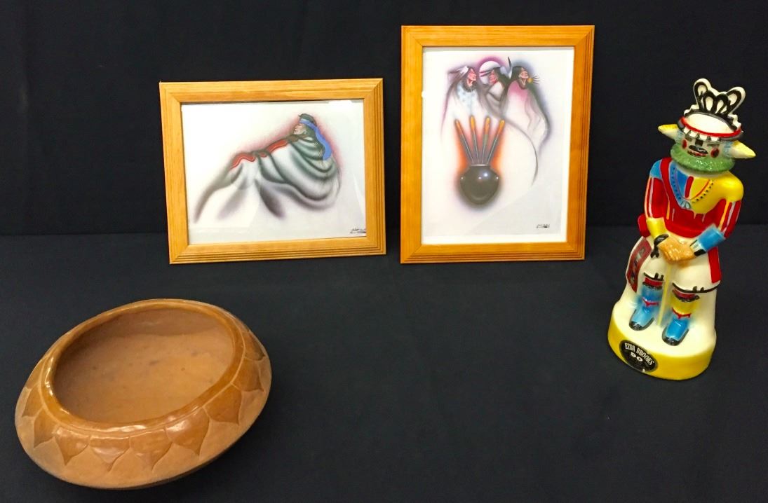 There are 2 - Robert Redbird prints measuring 12" x 10" each. An Ezra Brooks whiskey decanter depicting a Hopi Kachina measuring 13.5 inches tall and a southwestern style pot measuring 10 inches wide by 3.75 inches deep. Please look closely at pics - they are an important part of our description. Shipping: There will be a $10 handling / packaging fee for shipping this lot. The actual cost of postage will be added on top of that.