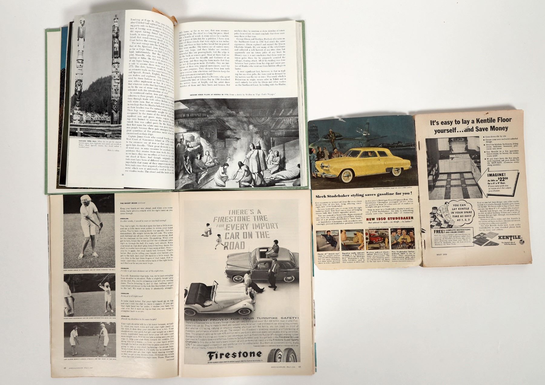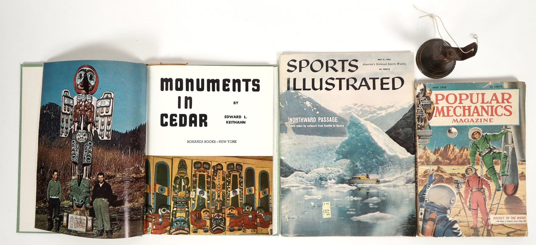 Lot of 4 different. 1) Popular Mechanics Magazine. May 190. "Rocket to the Moon." Also articles on the impact of the hydrogen bomb. Great futuristic cover. Chips on bottoms of pages. 2) Sports Illustrated. May 9, 1960. Cover story on trip from Seattle to Alaska. Fishing tips. 3) Monuments in Cedar. Book on totem poles by Edward Keithahn. 160 pp. Hardcover. 4) Bonus Americana item is a bronze & iron sleigh/door bell. 2"