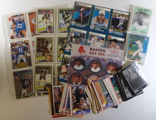 Includes 1992 Fleer The Performer 24 cd set. 1995 Red Sox Milk Cap Set, Sports Illustrated 9 cd sheet, 1959 Reprint Set Baseball, 6 - Drew Bledsoe Cards, 9 - 1984/85 Topps Hockey Cards, 9 - Jeff Gordon Cards, 31 - Pacific Ryan / Seaver Cds and 11 - Black & White Con lon Cards featuring Babe Ruth. Est. Value $40.00 - $50.00.