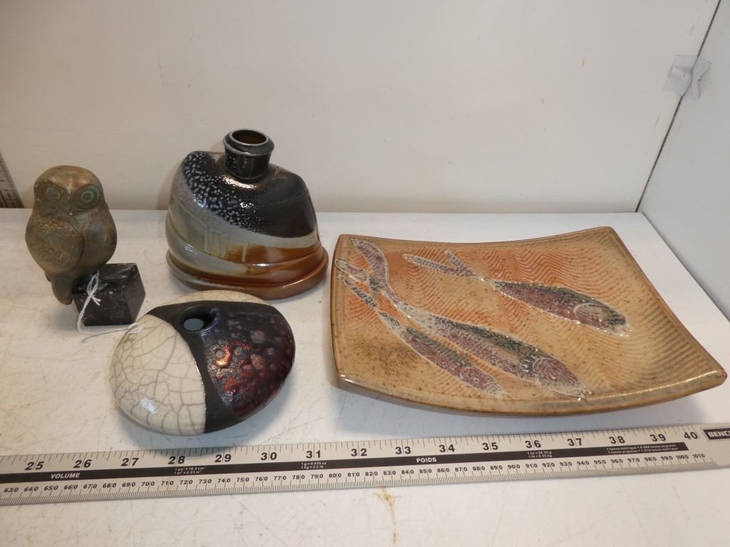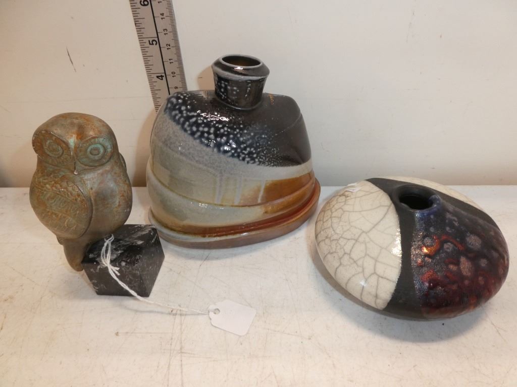 Misc. Stone Art Pieces, 2 Vases, Carved Owl,