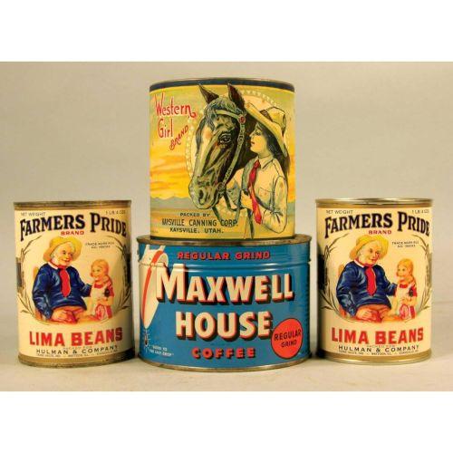 Misc. Store Cans with paper labels including Farmers Pride Lima beans, Western Girl tomatoes and 1 lb. unopened tin of Maxwell House Coffee. All in excellent condition.