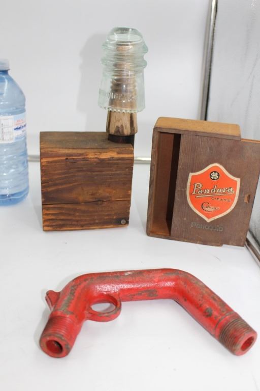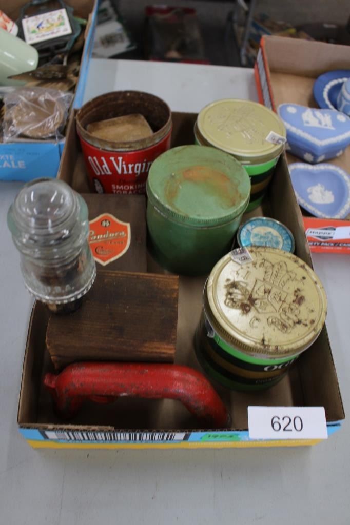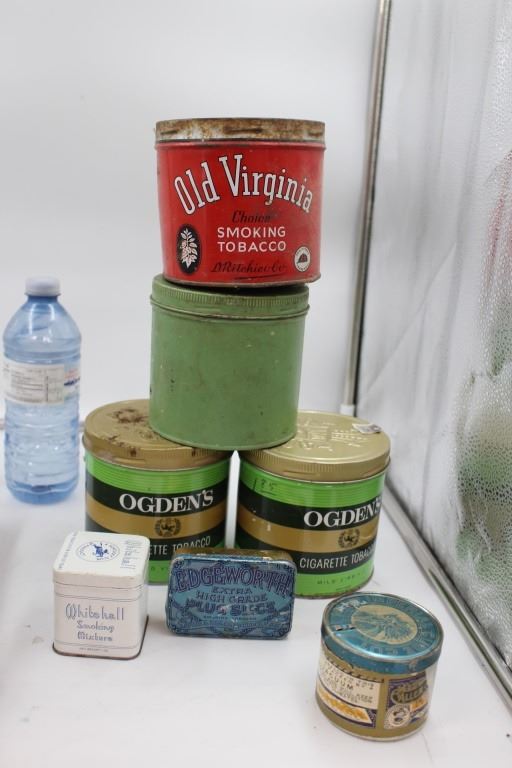 Misc. Tobacco Tins and Glass Insulator on Wood