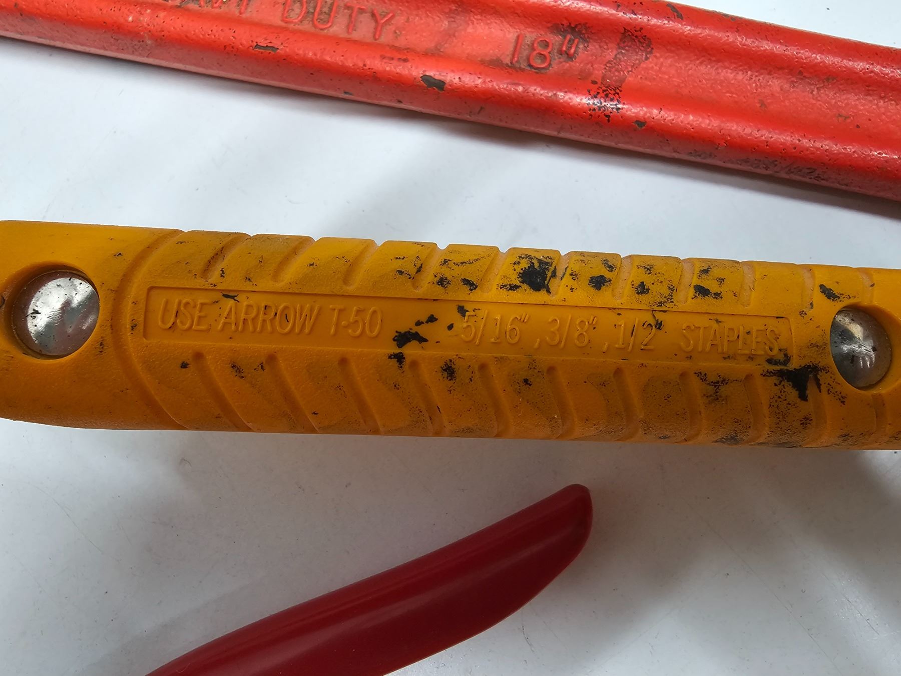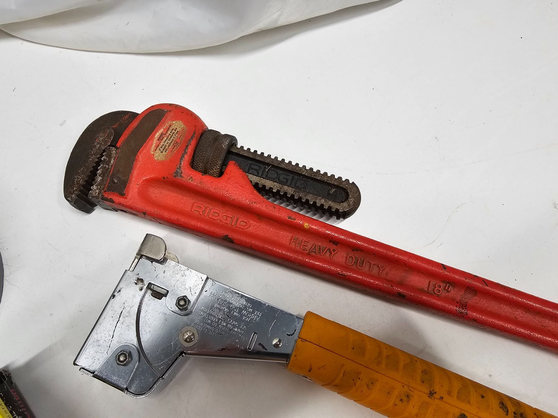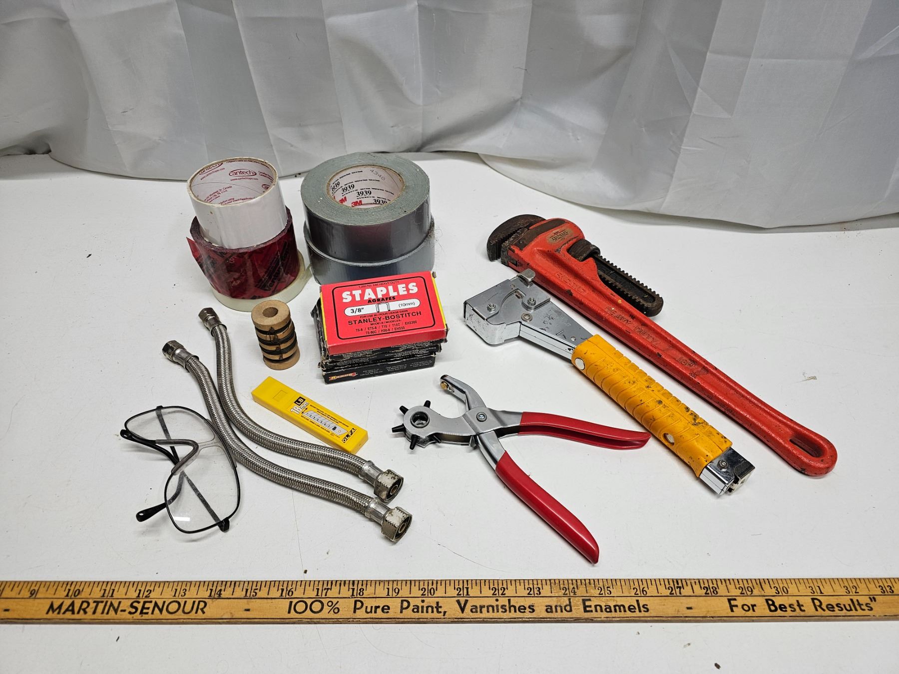 18" Rigid HD pipe wrench, stapler with 4 packs of staples, leather hole punch, 18mm OLFA blades, safety glasses, plumbing steel braided hoses, duct tape, roll of wire, misc. tape.