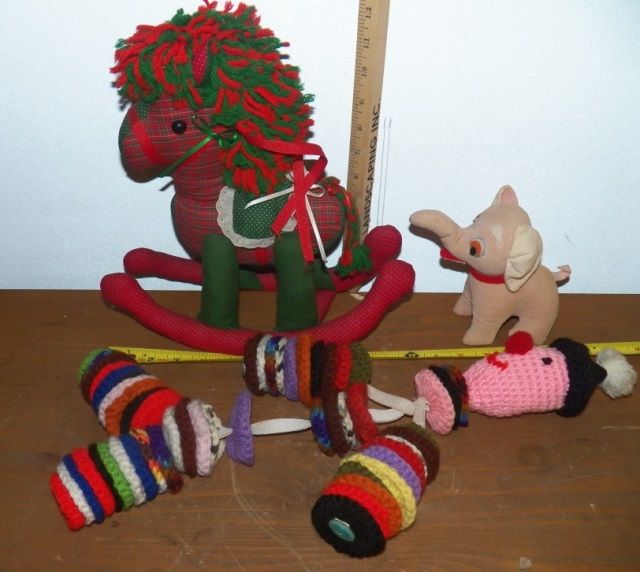 Stuffed Rocking Horse, Stuffed Elephant & Knitte Crochet Clown