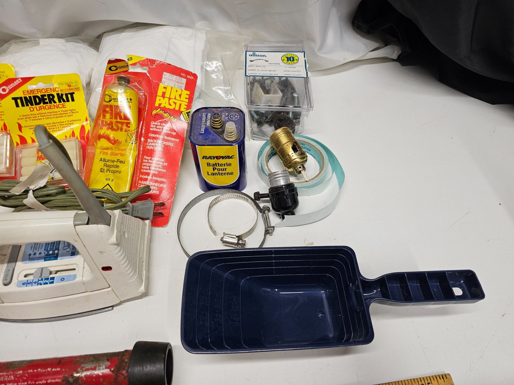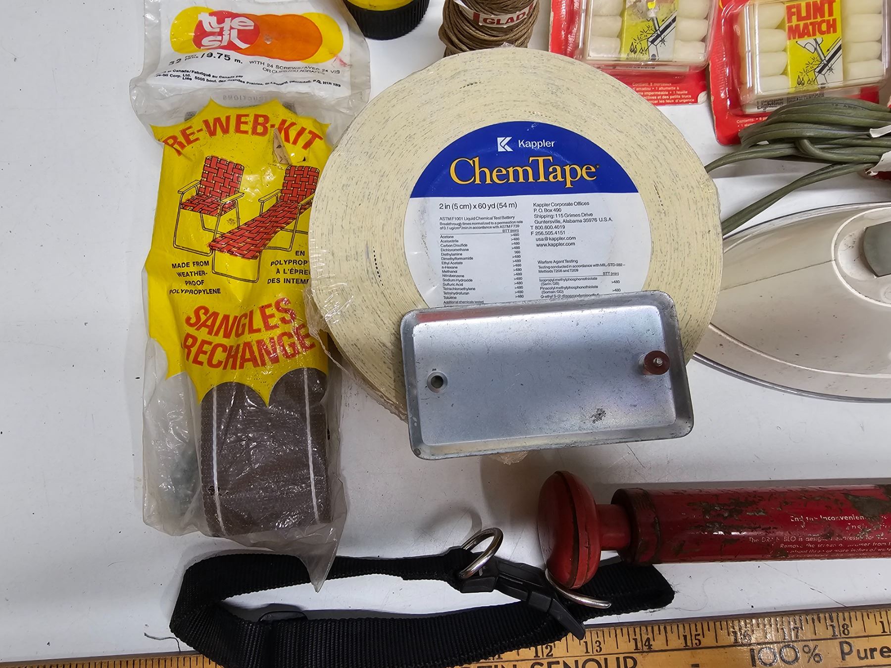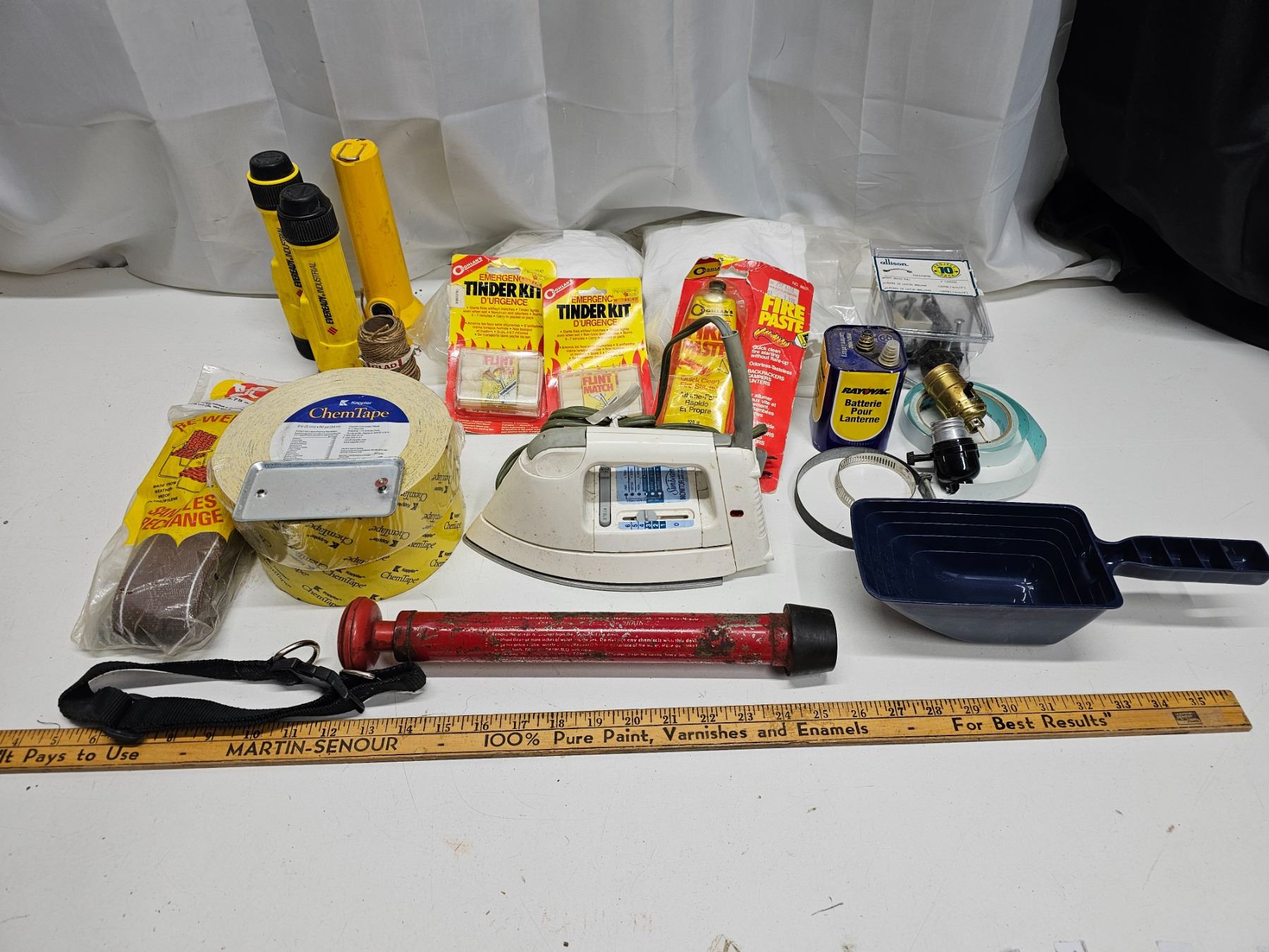 3x flashlights, vintage drain plunger, rayovac lantern battery, chair re-web kit, 2x chemtape rolls, fire starter, measuring scoop, dog collar, electric iron, clamps, hardware, string.