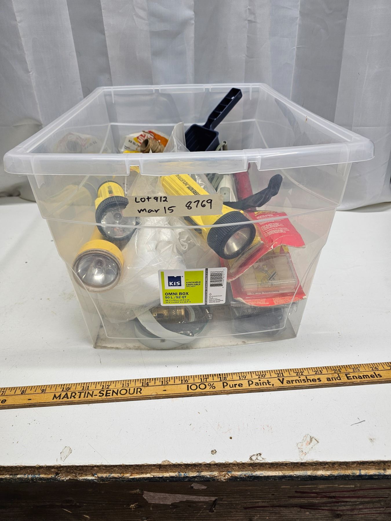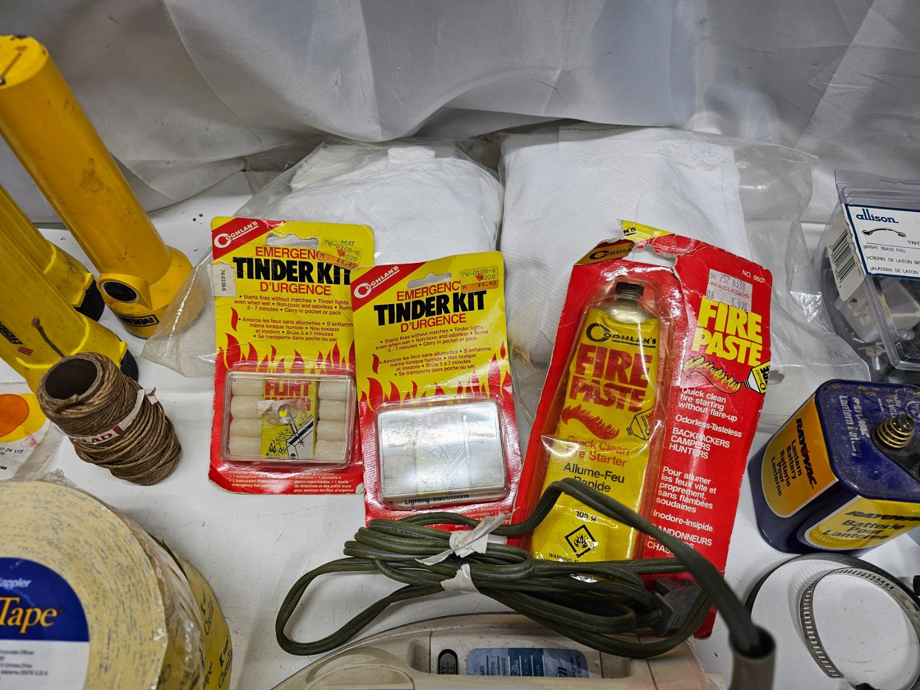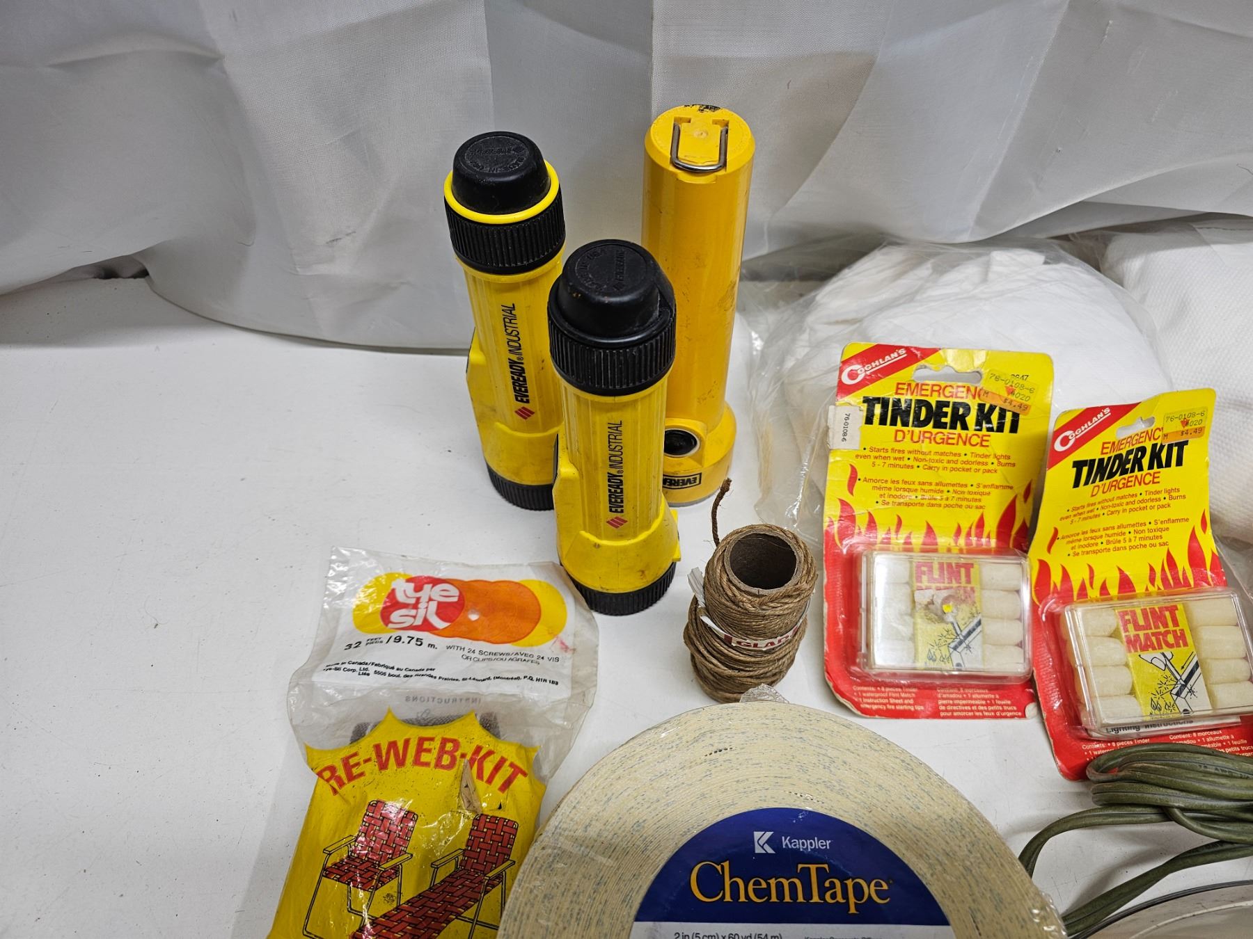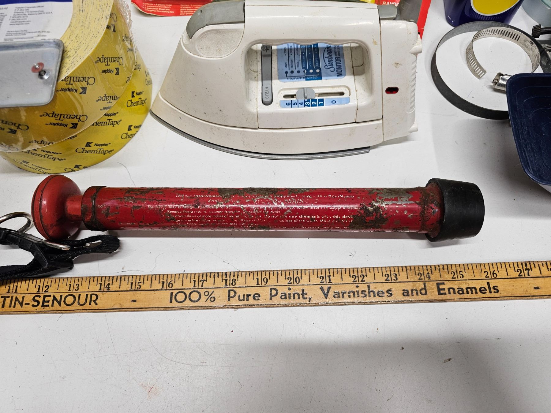 3x flashlights, vintage drain plunger, rayovac lantern battery, chair re-web kit, 2x chemtape rolls, fire starter, measuring scoop, dog collar, electric iron, clamps, hardware, string.