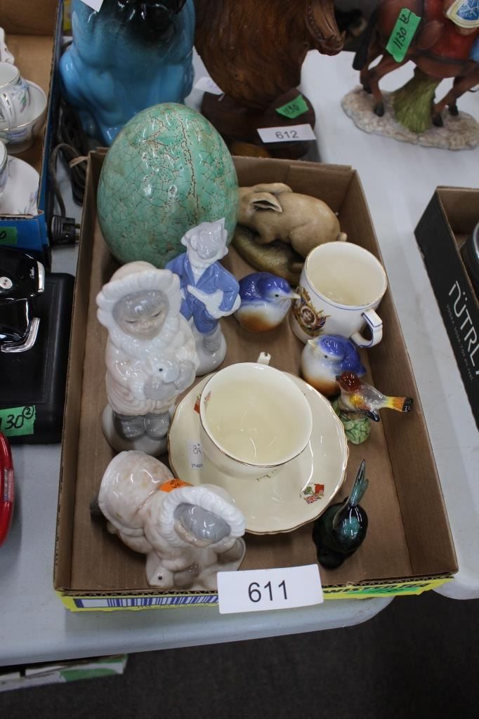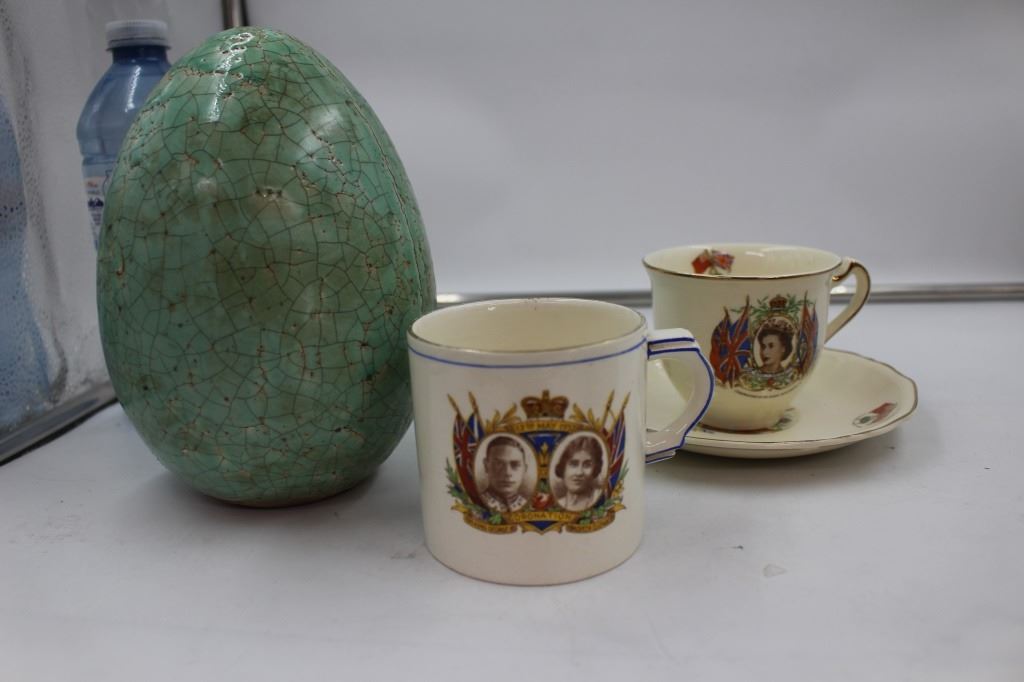 Cup and Saucer, Royalty Cup Coronation 1937 King George and Queen Elizabeth, Green Ceramic Egg Birds Salt and Pepper Set