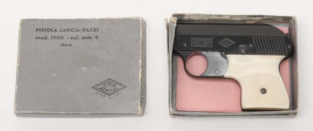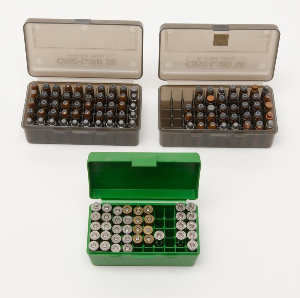 Misc. bonanza lot including several hard rubber butt plates, a starter pistol in box, a Colt SAA black box with black tape around the edges of the lid and spine; lot of misc. reloads (for brass only). Est.: $50-$100.