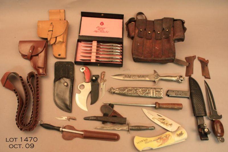 Misc. box lot of leather, knives and assorted items including a small mult-function set of pliers, a Victorinox pocket knife, four large fantasy knives, several sharpening files, an older dagger and leather sheath, two modern leatherflap holsters for military semi-auto pistols, an older leather European ammo magazine shoulder bag; a pair of checkered wood High Standard grips and a boxed set of six stainless steel German Empress table knives. Est.: $50-$100.