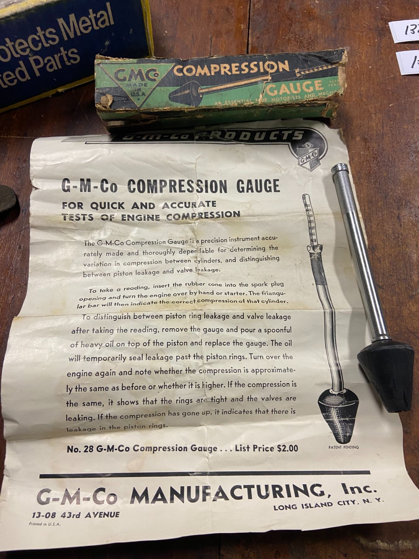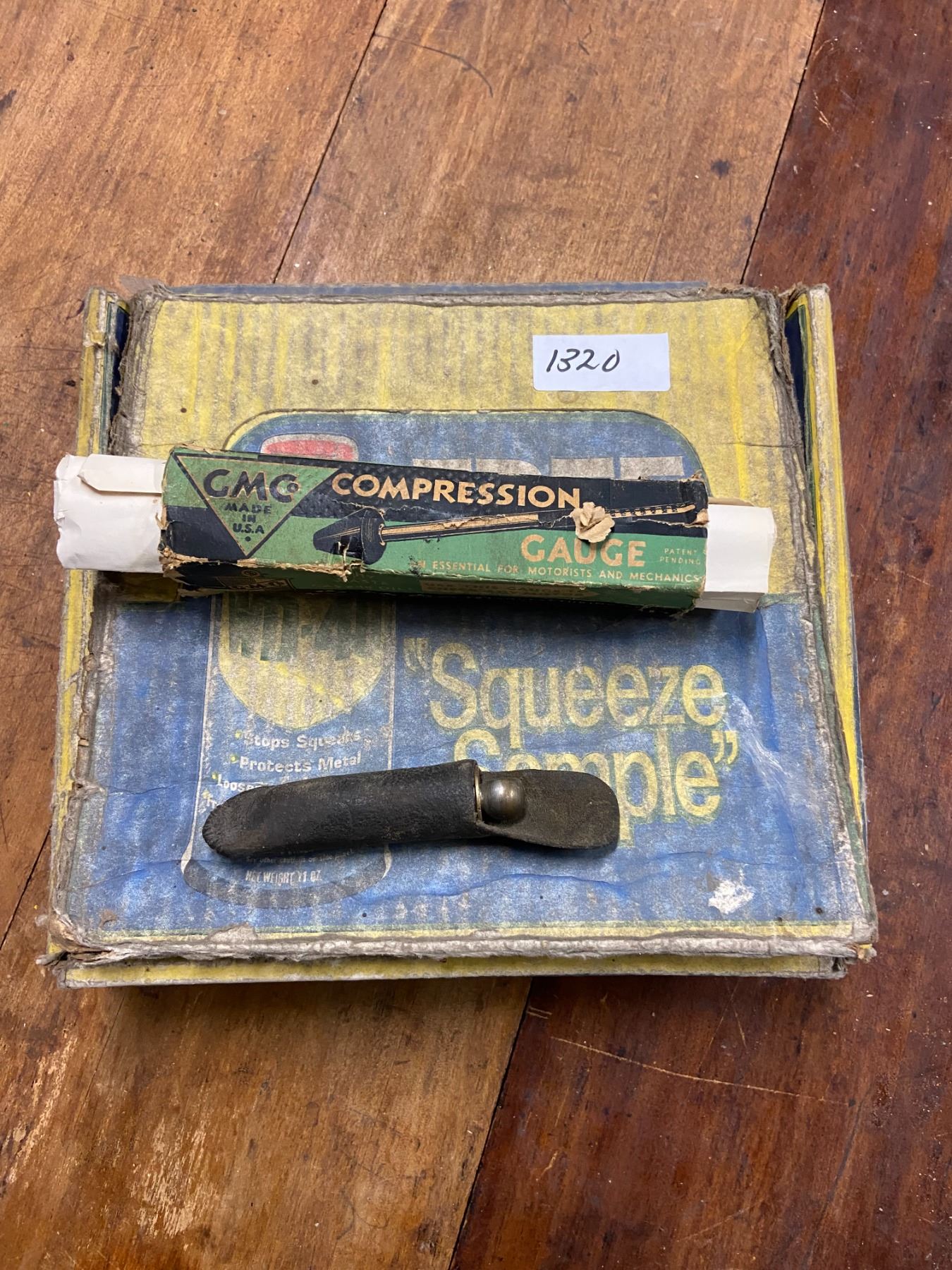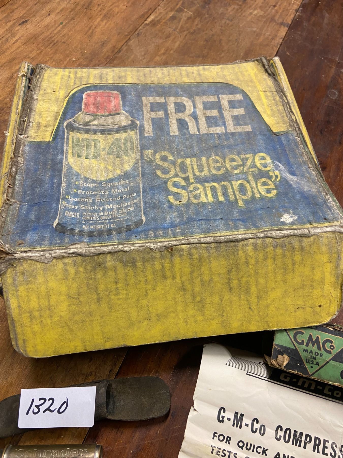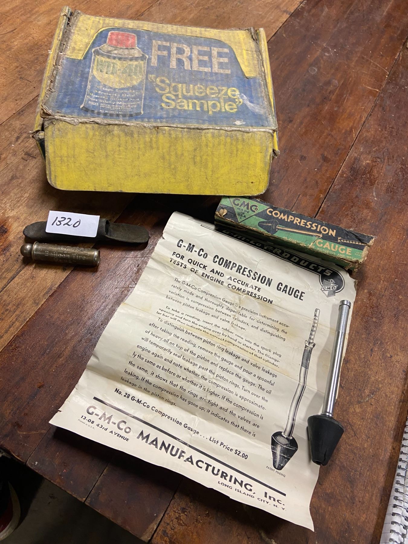 Balloon tire gauge (Schraeder), GMC compression gauge in original box, and WD40 samples in original box