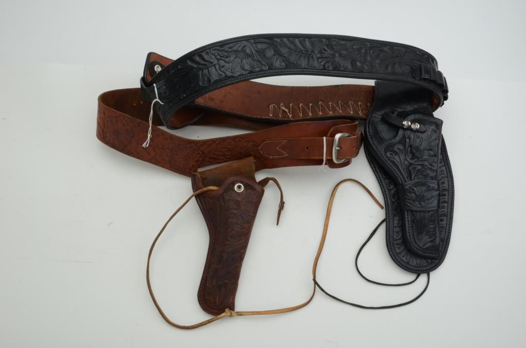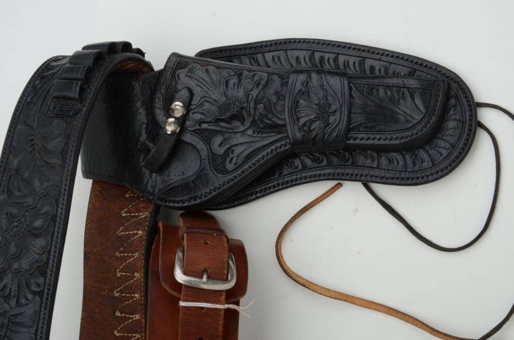 Misc. collectible leather lot including a US marked leather satchel bag that was at one time half of a pair of saddle bags (other side now missing) in overall good but dry condition; an N. Porter marked tooled leather holster with tooled cartridge belt in overall good condition; an unmarked black tooled leather single loop holster and cartridge belt in overall fair to good condition; an unmarked leather holster andthin cartridge belt in fair condition and a plain brown leather holster and cartridge belt in overall good condition; good lot for the gun show circuit or end-of-trails events. Est.: $100-$200.