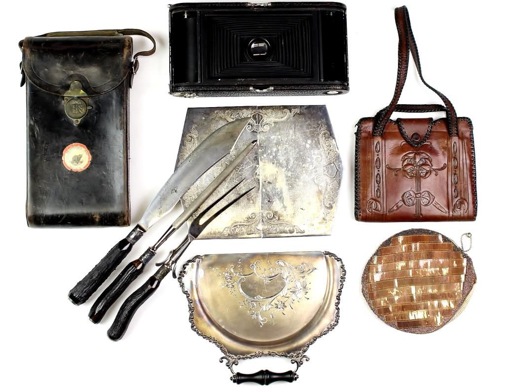 Misc. collection includes meat set, crumb tray, silver plated trivet, hand bags and antique Kodak camera.