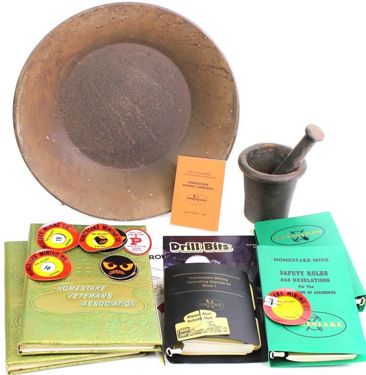 Misc. collection of Homestake Mining items includes safety award, books, gold pan, mortar with pesta