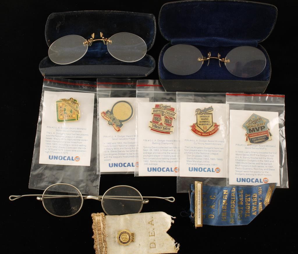 Misc. collector’s lot including 3 pair of antique reading glasses (2 in cases; 1 case marked Dorr/Beverly Hills/Hollywood/Los Angeles; the other case is tagged “F.D.R./TOPS/9X/4/15/87”); a guest ribbon and I.D. for the Sept. 7, 1937 Heisman Memorial Football Trophy Award with name “RUDY VALLEE”; a guest ribbon marked D.E.A. with metal “President” hanger and a City of New York Detective/DEA label pin added plus 5 UNOCAL 76 commemorative L.A. Dodger pins. A neat little lot of memorabilia with some great pieces! Est.: $100-$200.
