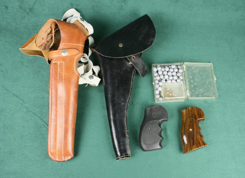 Misc. collector lot including an unmarked  leather shoulder holster for a long barreled  semi-auto pistol like a Woodsman or  Hi-Standard, a reproduction leather flap  holster for a Colt Model 1860 Army revolver,a pair of Mustang brand after market wood  grips for a K frame Smith and Wesson  revolver, a pair of combat checkered hard  rubber grips for a medium frame revolver,  some modern cast lead balls and percussioncaps for a black powder revolver and a  leather George Lawrence maker cartridge case  with 18 Savage .250 caliber rounds.  Est.:   $40-$80.