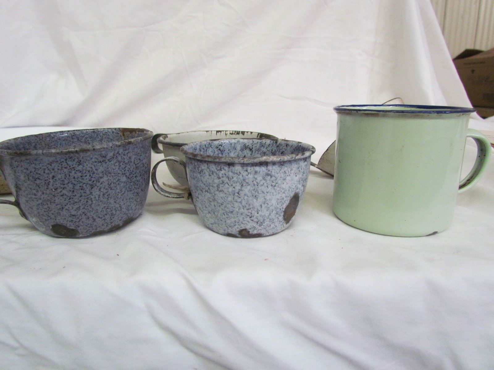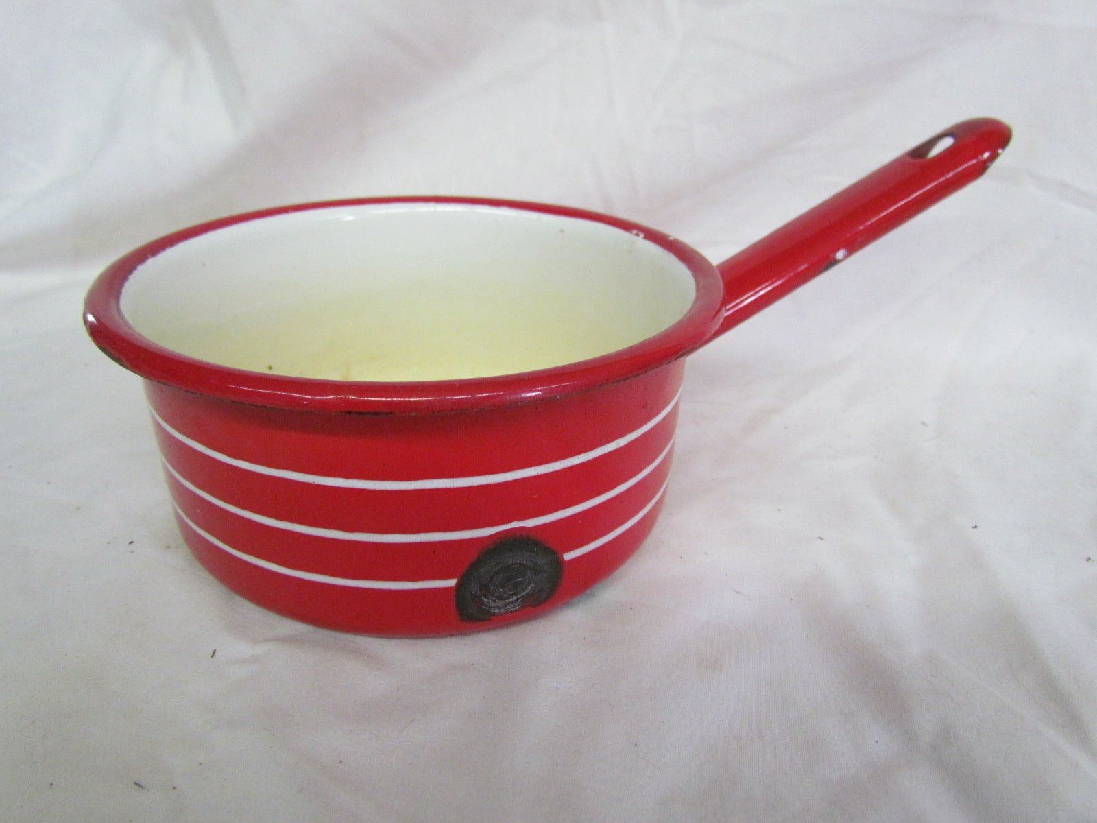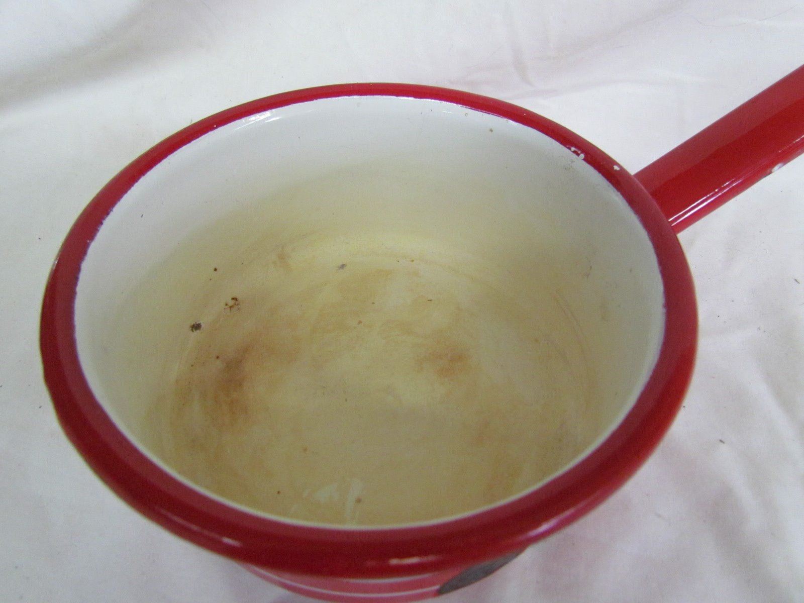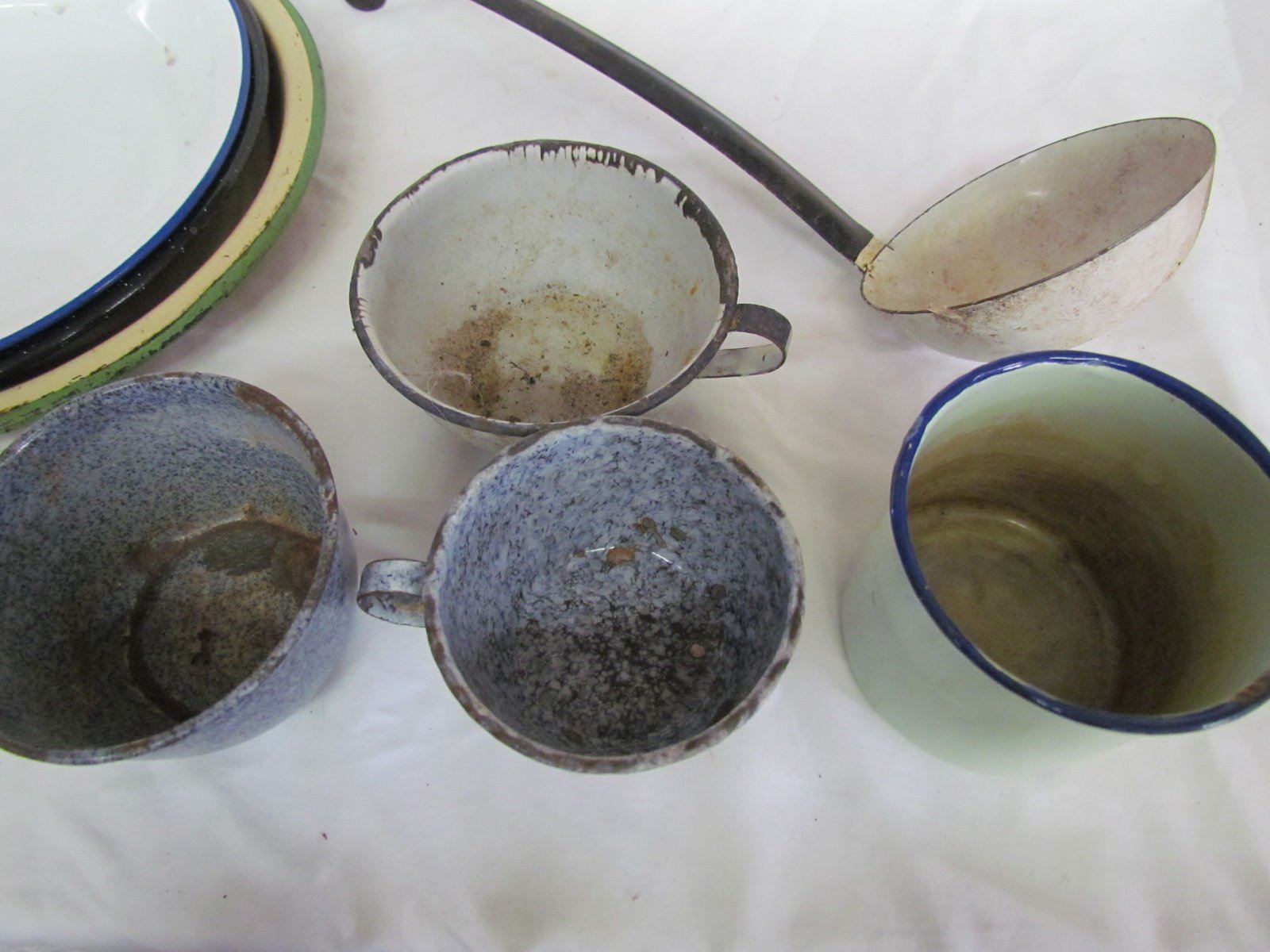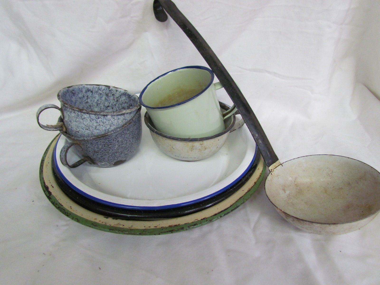 Misc kitchen items - 3 plates, 4 cups, ladel, red pot