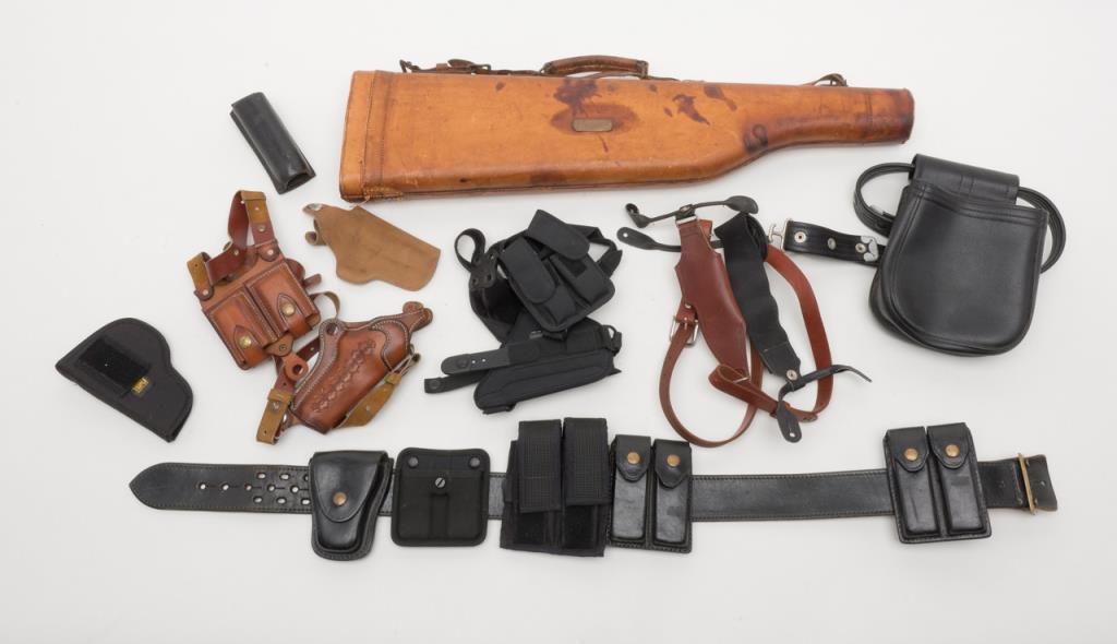 Misc. leather lot including holsters, magazine holders, range bag, shotgun mutton case, belts, etc. Est.: $125-$175.