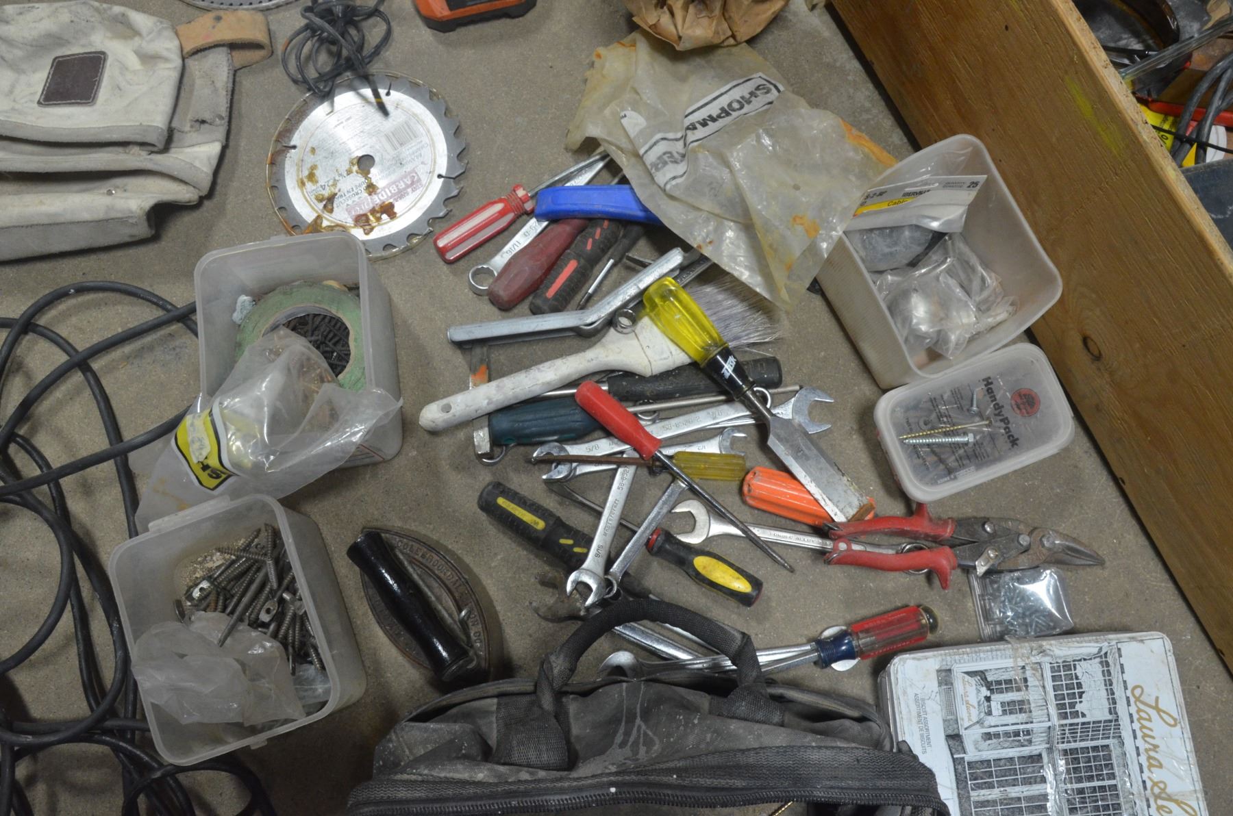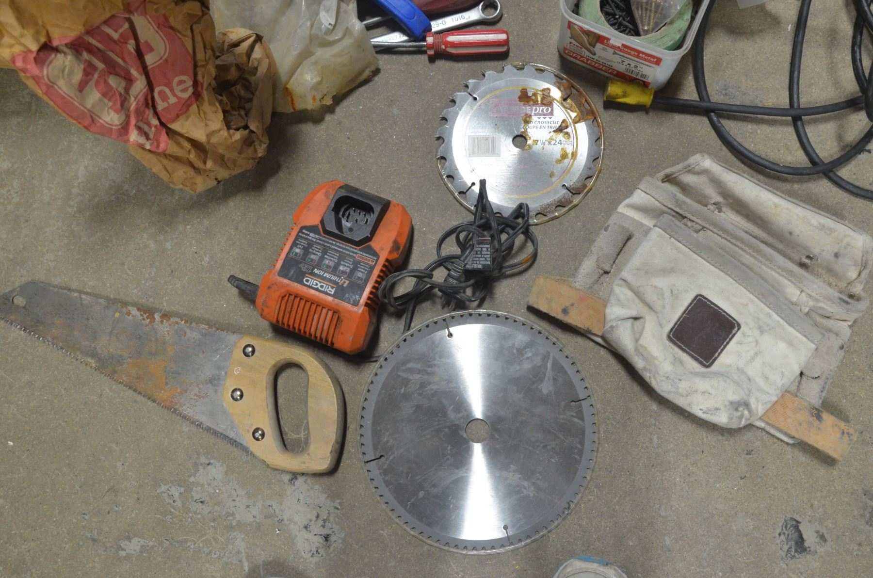 Misc. lot, Wrenches, Screwdrivers, Saw Blades, Cords, Screws, Nails, ect.