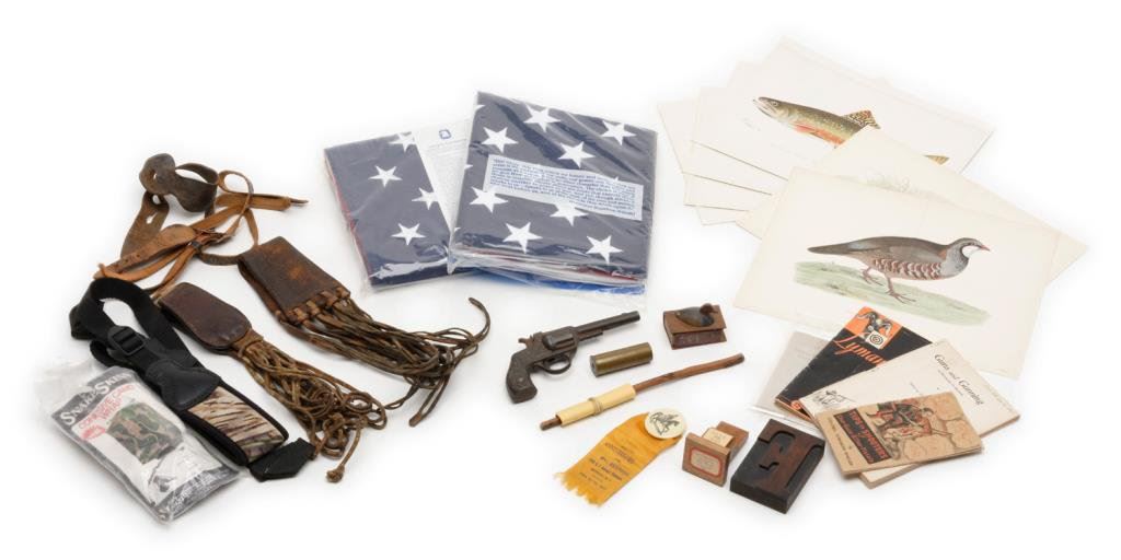 Misc. lot consisting of two U.S. flags, new in wrappers; 6 older color lithograph prints of game birds and fish; an all metal old “SCOUT” cap gun; misc. leather slings & straps; a Lyman sights catalog from 1947; a Guns and Gunning booklet w/out cover (1908 copyright); a Col. Whelen Tips to Shooters” catalog and a Little Blue Book No. 301 “Sailor Chanties and Cowboy Songs” and a 40th Anniversary Reunion (1901) 18th N.Y. Cavalry Veterans celluloid and ribbon. Est.: $100-$150.