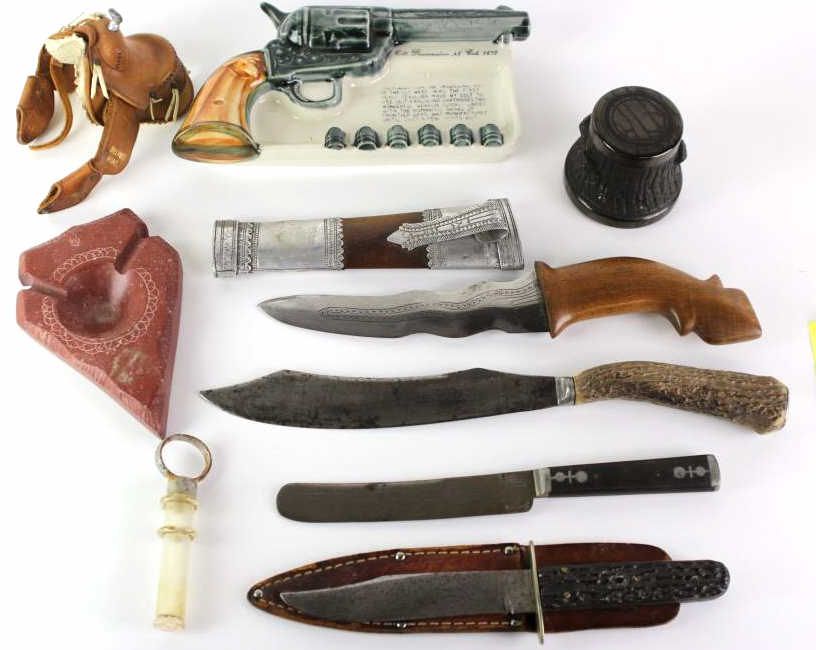 Misc. lot includes 4 knives, miniature Montana saddle, black porcelain paperweight, civil war period glass syringe, red pipestone ashtray, ceramic Colt ashtray.