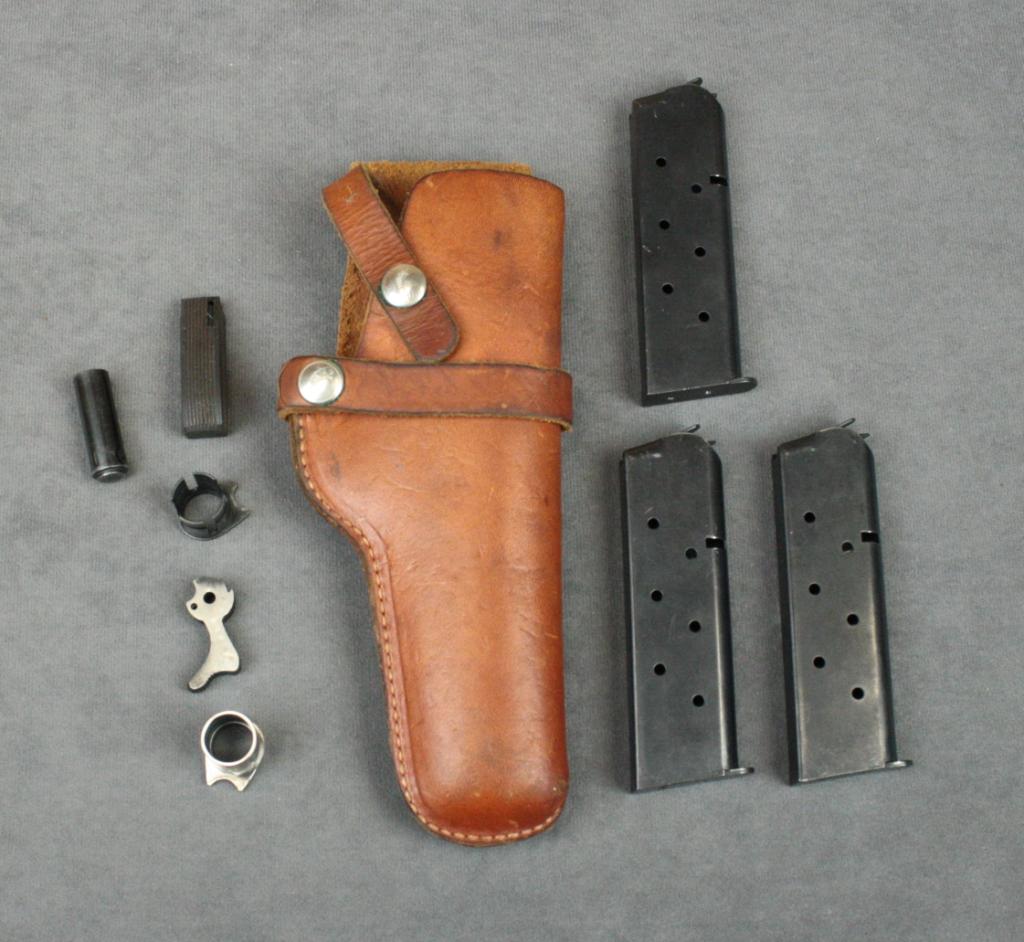 Misc. lot including a Hunter leather holster,  three Colt 1911 style magazines with  assorted parts, two Savage bolt handles,  Garand floorplate, two K-31 carbine butt  plates, etc.  Est.:  $100-$150.