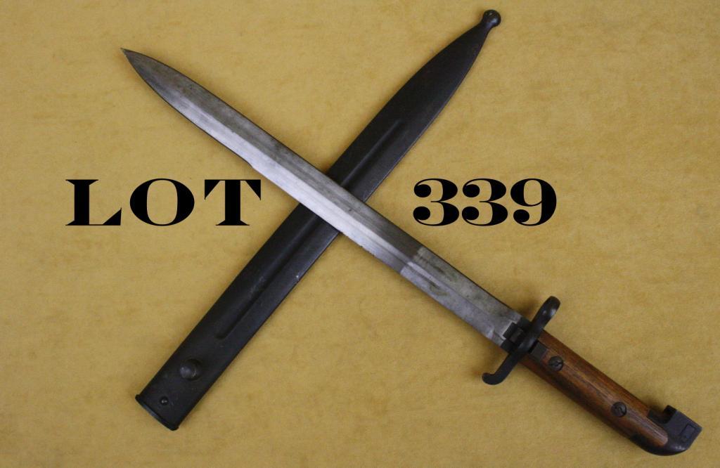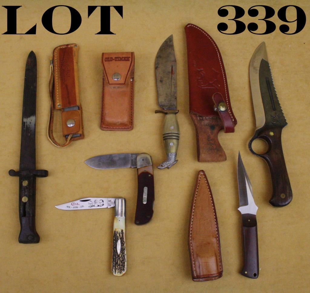 Misc. lot of 5 knives and two bayonets including a large Spivey Sabertooth knife and leather scabbard in good condition; a Stapel custom skinning knife and leather scabbard in excellent condition; a Schrade “Old Timer” folding knife with leather belt sheath in good condition; a Case Commemorative folder with stag scales in good condition; a Schrade honing stone in leather carry case; an old Mexican made knife with bone handle, approx.10” overall and two bayonets, one a European military style with wood grip and metal scabbard in good condition and the other, a cut down British or Canadian bayonet in rough condition, approx. 14” overall. Est.:$200-$300.