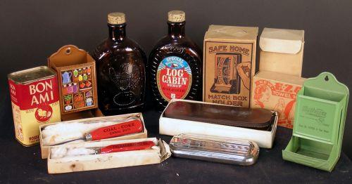 Bon Ami cleanser 1949 unused, Dr. Pepper match holder in original box unused, Diamond Match Safe Home match box holder in original box unused, EZ Grip towel holder in original box (unused) logo North Bend Hatchery, Hallmark match holder circa 1982, 2 L