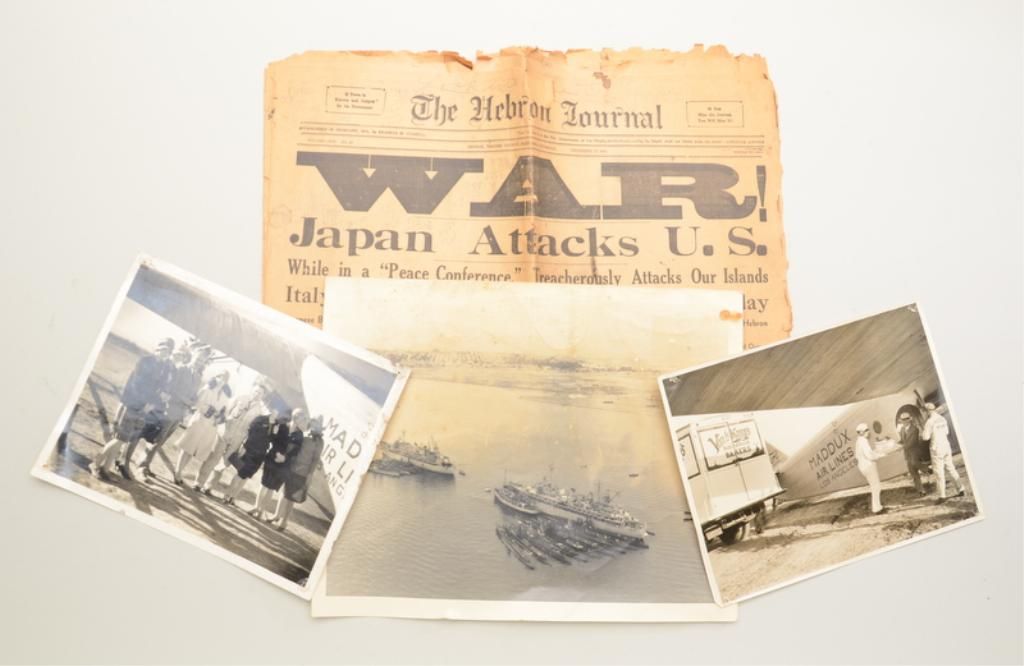 Misc. lot of WW II collectibles including a paper Model B-17 F-G Flight Computer, a German propaganda booklet entitled “Das Neue Reich” (The New State) with dozens of photos of nazi figures and events; photos of wartime ships, a Dec. 11, 1941 newspaper with headline “WAR” and a nazi flag with small nazi pendant both appearing to be possible soldier bring backs. Est.: $100-$200