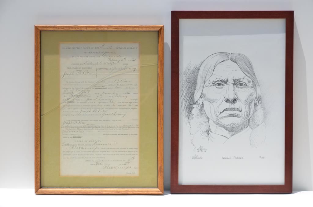 Misc. lot of collectibles including 5 different size iron cannon balls ranging in size from approx. 1-1/2” to 3-1/2”; a framed limited edition (16/100) black and white print of Quanah Parker by Bill Leftlllich(’78), approx. 18” x 12”; and a framed and matted original State of Montana, County of Missoula Court document dated February 4th, 1902 indicating a Joseph St. Peter being convicted of Grand Larceny and beingcommitted to State Prison for one year at hard labor and a civil judgment be entered against him for the cost of prosecution in overall good condition, frame is approx. 17” x 13”; glass shows one crack horizontally not affecting the document. Est.: $50-$75.