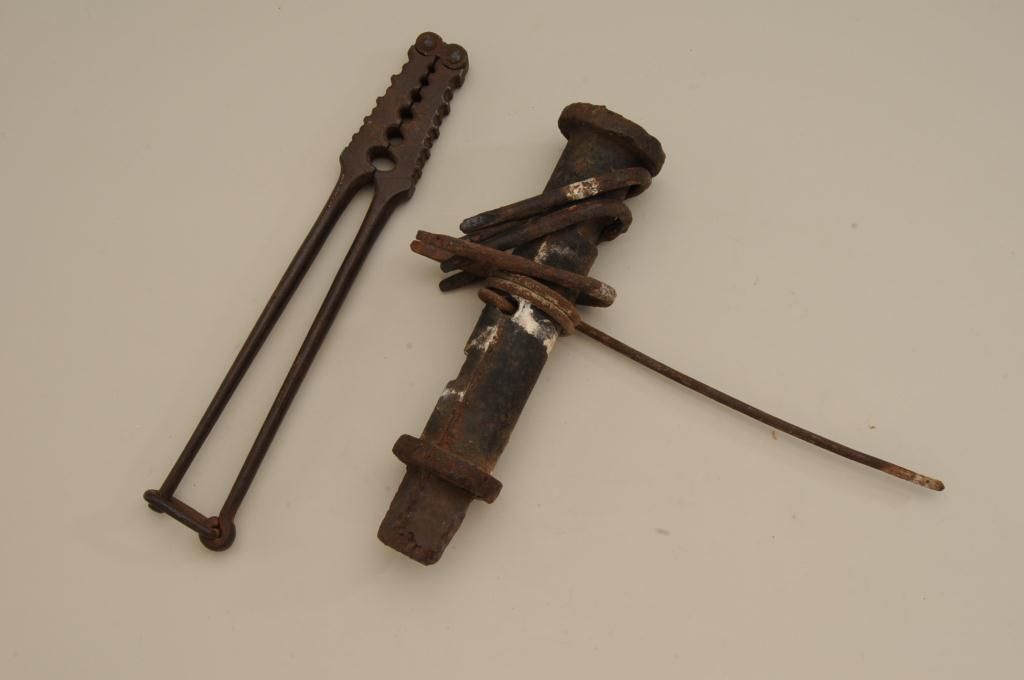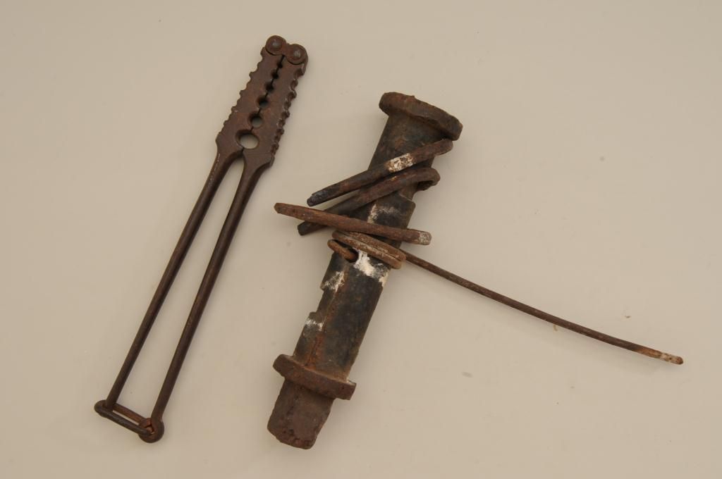 Misc. lot of collectibles including an iron fence stretcher with misc. parts, a small oil can, a Dupont Superfine FFg Gunpowder can and a small metal commemorative bust statue of Admiral Dewey. Est.: $100-$300.