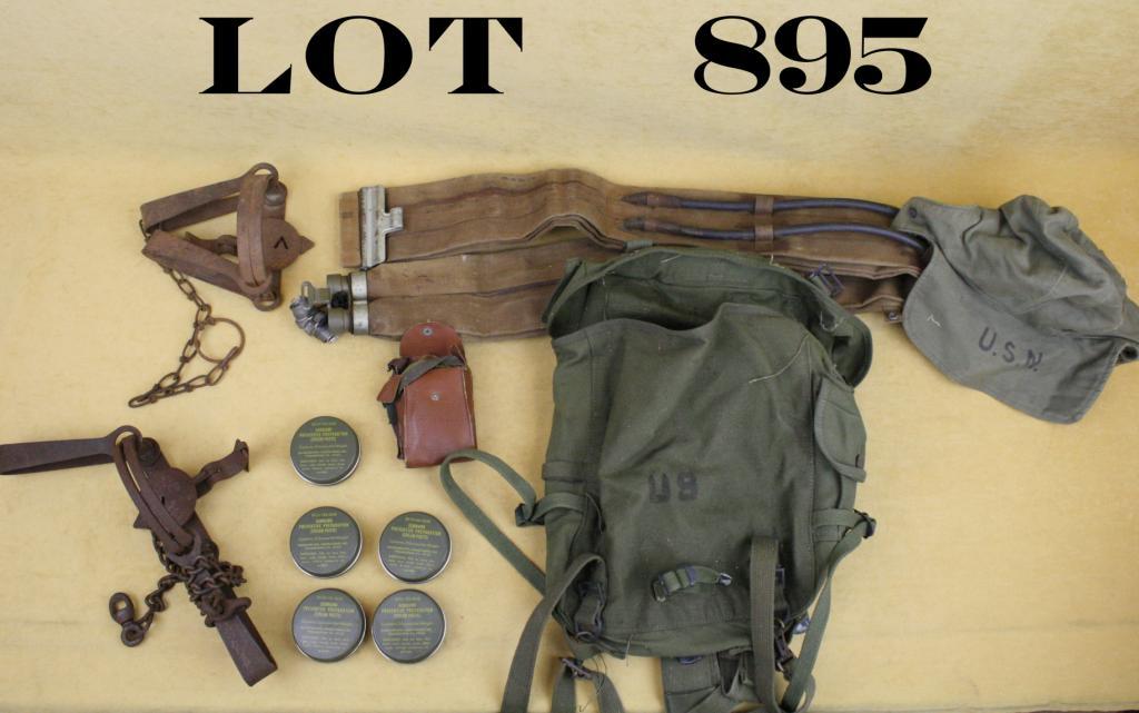 Misc. lot of estate items including two old iron traps, several GI sunburn preventative cream paste cans, a deteriorated pair of old military type goggles, an old USN inflatable waistband, a Naval backpack and woven USN cap with neck protective drape. Est.: $50-$75.
