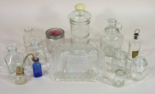 Misc. lot of glass bottles and jars plus glass butter dish, no lid.