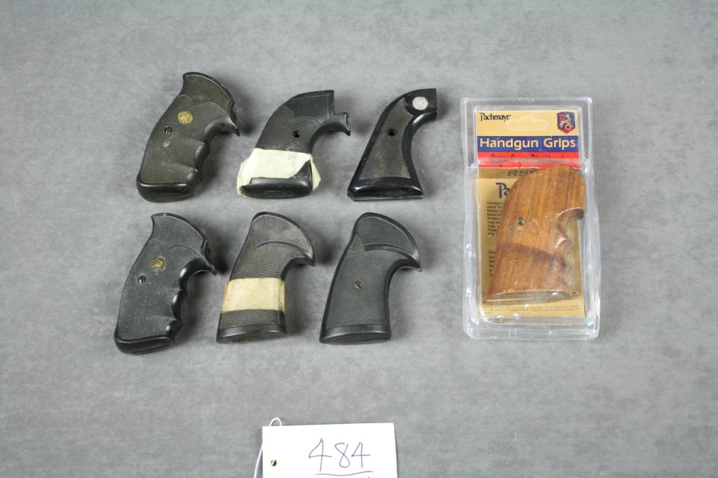 Misc. lot of grips including five Pachmayr checkered rubber grips for handguns, a pair of plastic Herter’s grips for a large frame single action, a pair of brown checkered plastic grips for a 1911-A1 style pistol, apair of finger groove wood Pachmayr grips for a Ruger Super Blackhawk, grips for a Smith & Wesson, etc. Good for the gunsmith’s work bench or for the gun show circuit. Est.: $100-$200.