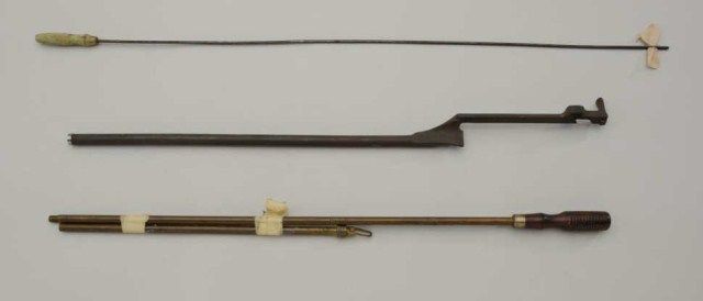 Misc. lot of gun parts including small cigar box of revolver screws, etc., a cylinder, a trigger guard and backstrap, a charging rod for an M1 Garand, an unmarked barrel for a revolver, a Winchester-marked axe head, a