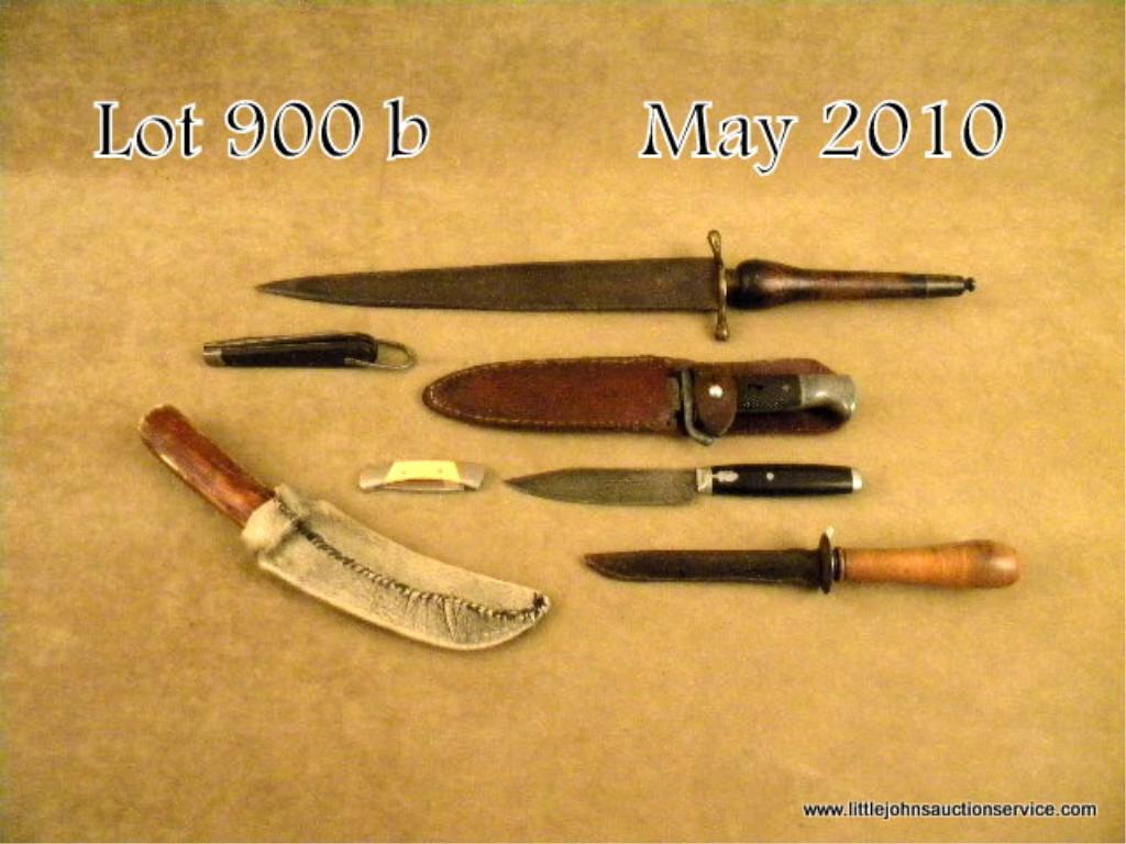 Misc. lot of knives including a Goodell Co. blade approx. 8” overall with wood grip and pewter inlays; a Camillus folding pocket knife in fair condition; an old I. Wilson skinning knife, approx. 10” overall, well-used with a leathersheath; a W & H Hutchinson dagger and leather sheath in overall good condition with smooth bulbous style grip; a small pocket Buck folder; a large blade hand-forged spear point knife approx. 19” overall with touch marks on both sides of thehilt and a bulbous wood grip with brass pommel; and a well-worn Hitler youth knife and scabbard, marked “M7/36” and “RZM” in a circle. Est.: $125-$250.