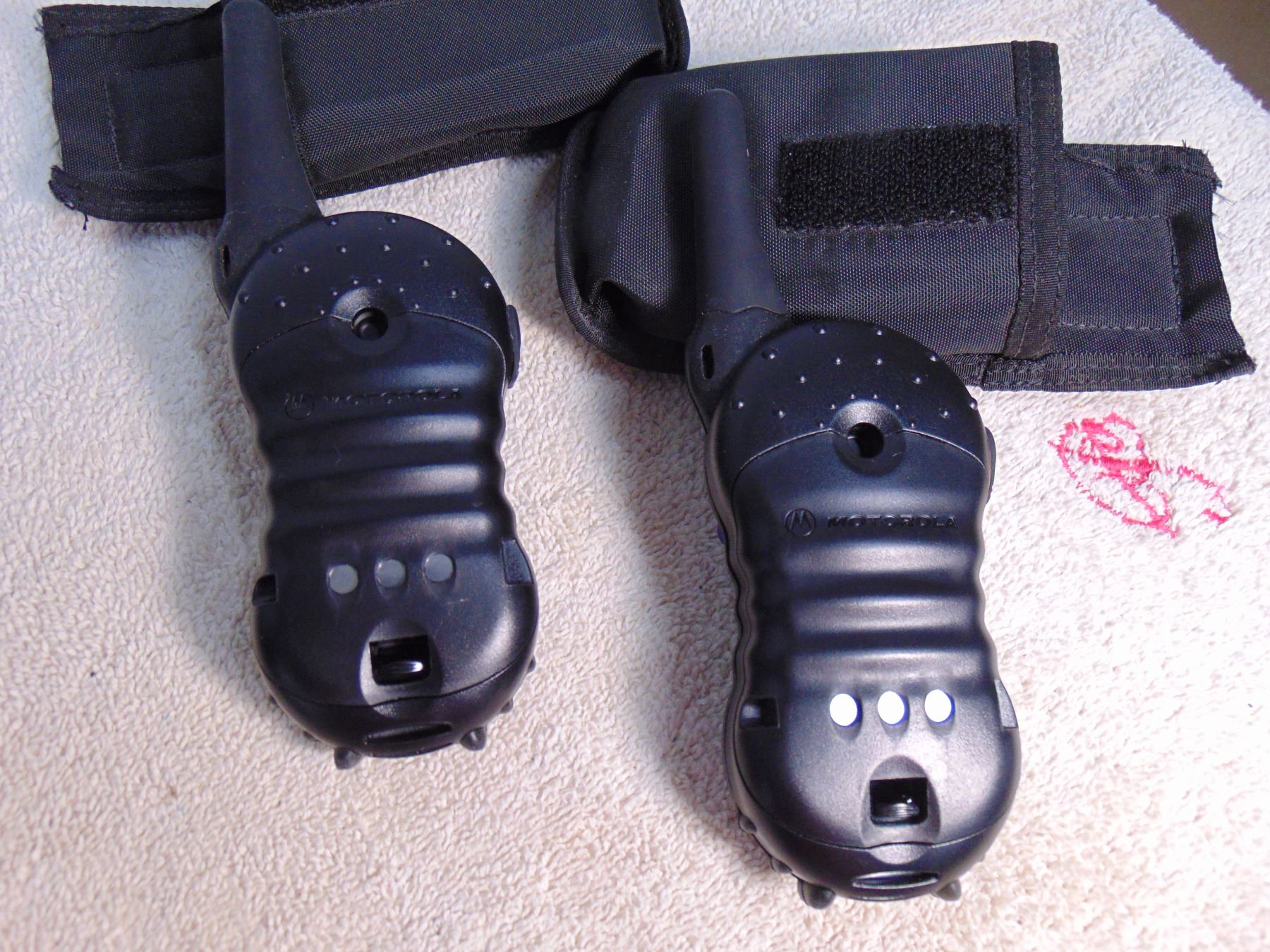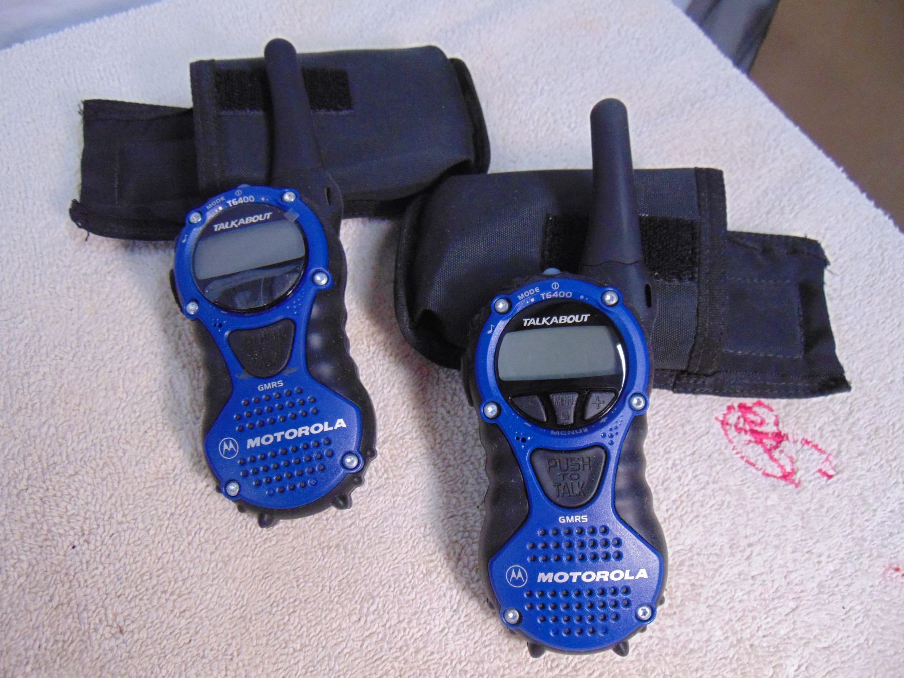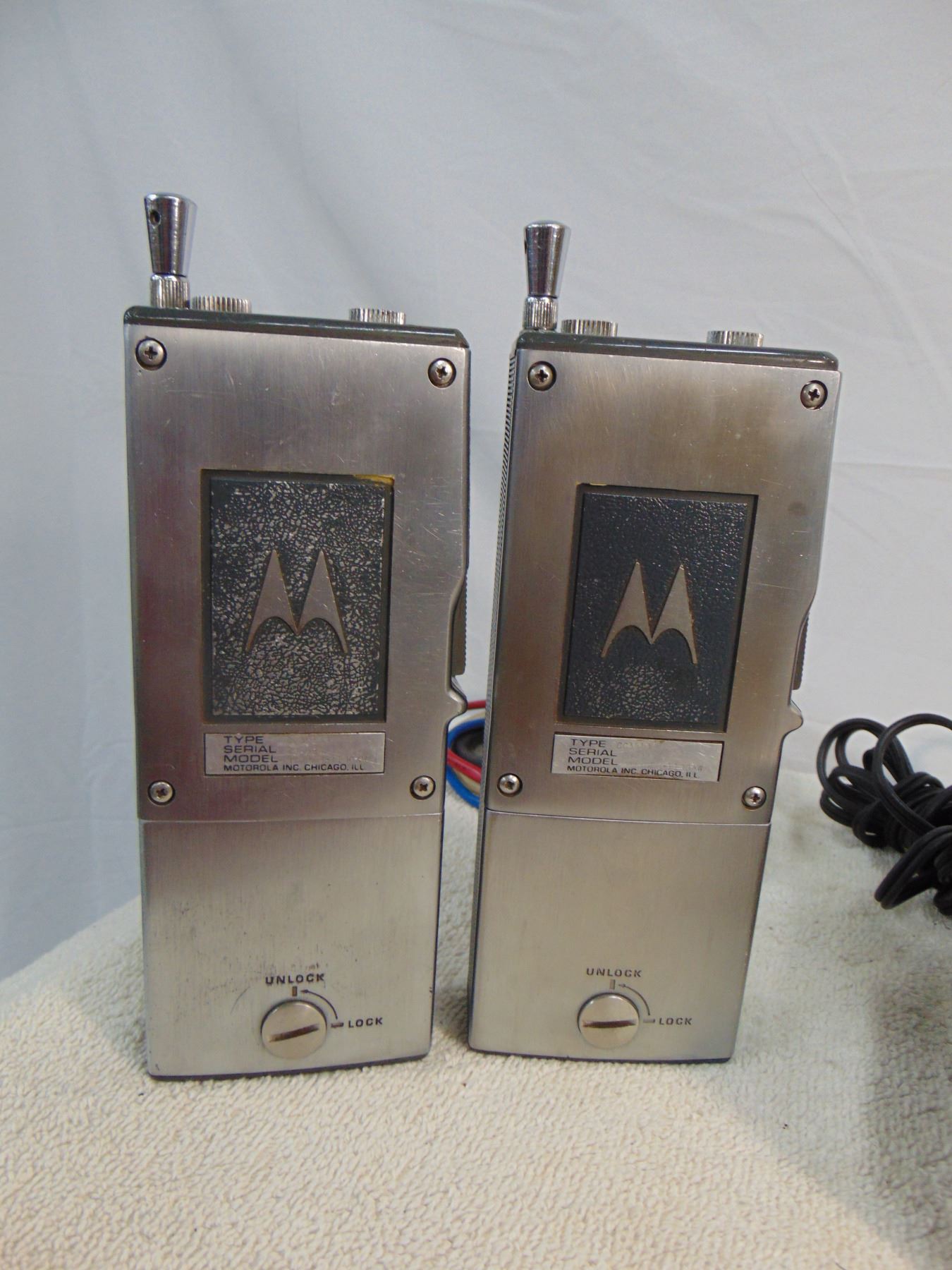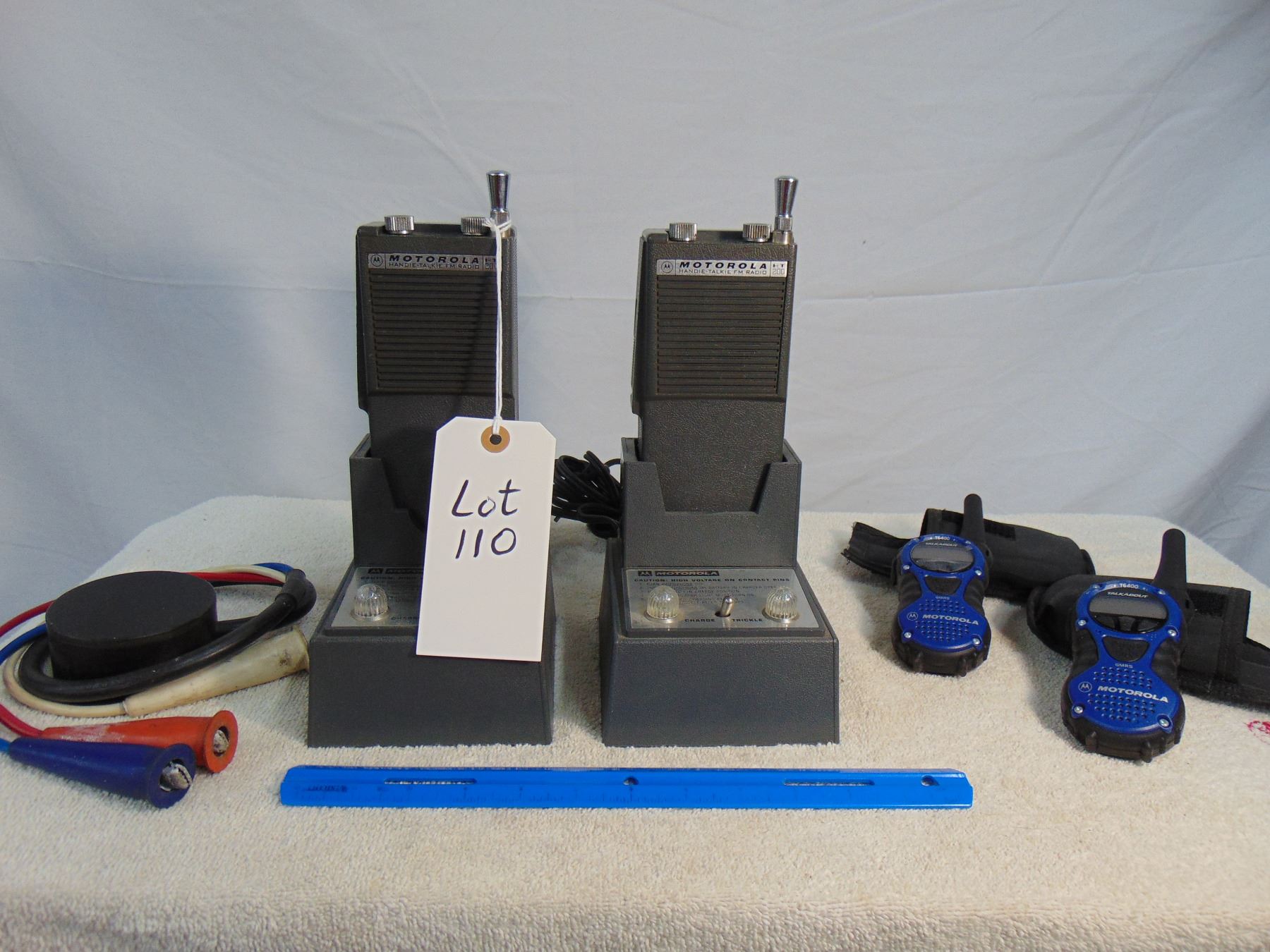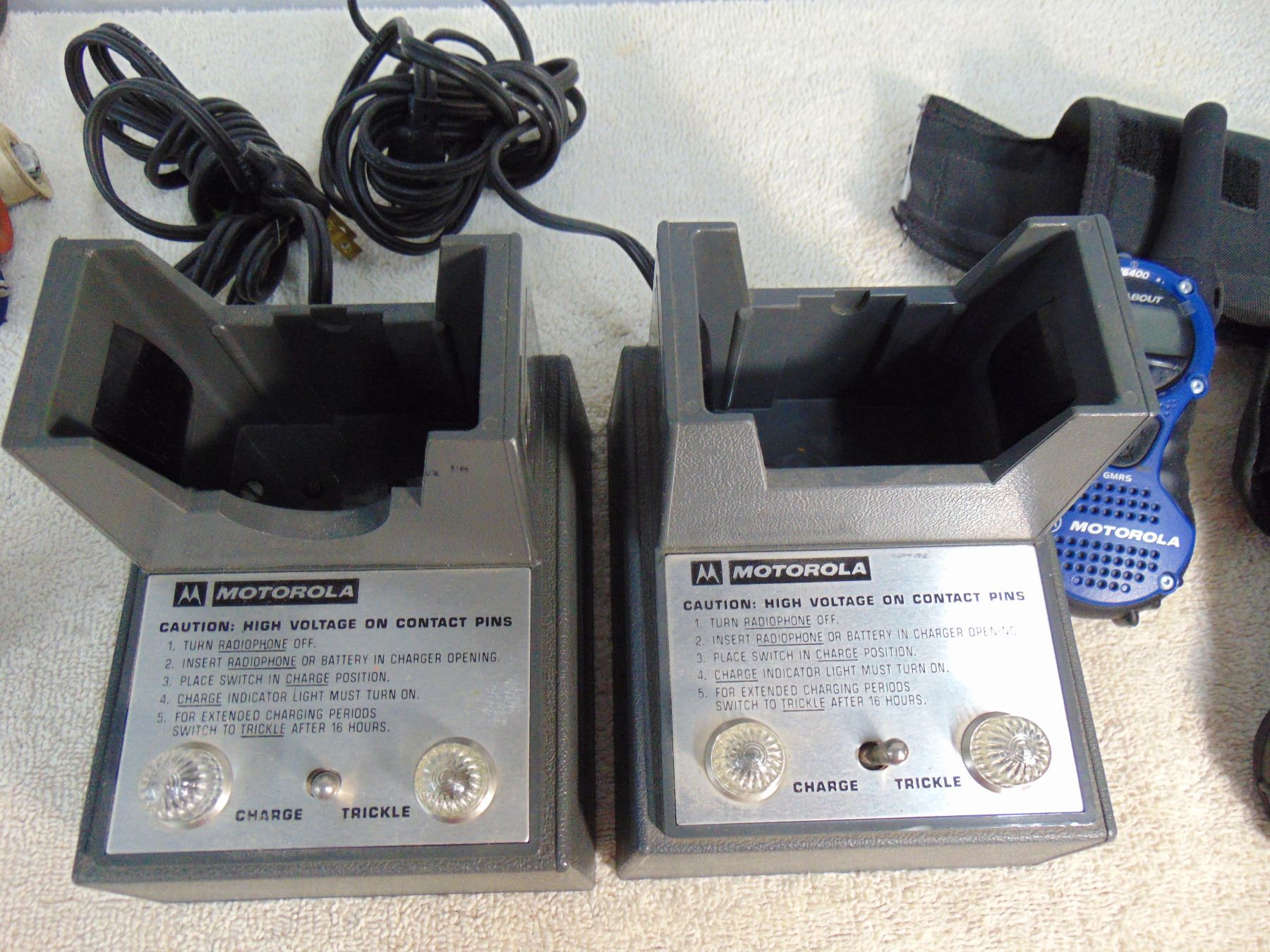 Pair of Motorola commercial grade portable FM radios with accessories and chargers
