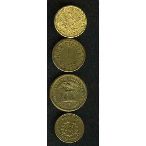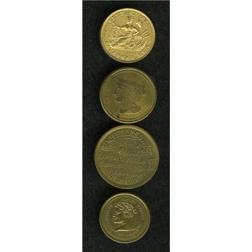 <B>Group of Four Miscellaneous Trade Tokens.</B></I> The lot includes: <B>John Eichler # HT-NY-NY 66;</B></I> <B>W.H. Hausman, Savannah, Georgia, GA-7;</B></I> <B>Jefferson Insurance Co., NY Catalog # HTT NY-NY 127;</B></I> and a <B>Consolidated Racket Stores # Wright 187.</B></I> All are listed in Rulau.