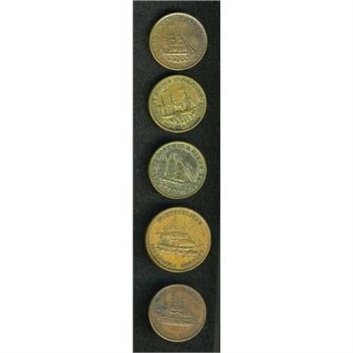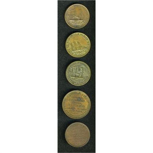 <B>Miscellaneous 1850s Ship Tokens.</B></I> Copper/brass, 27-29 mm. Includes: <B> (1850-53) Doremus and Nixon, Miller-224,Choice AU; Miller NY-224B, brass, two pieces; Rulau NY-NY-210, Metropolitan Insurance Co. 1866; </B></I>and <B>Miller NY-573, Metropolitan Insurance Co. 1852.</B></I><BR><BR><b>Shipping:</b> Coins & Currency (<a target="_blank" href="http://www.heritageauctions.com/common/shipping.php">view shipping information</a>)