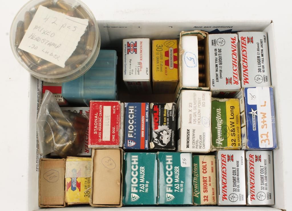 Includes .32S Colt, .30 Luger, .32 S&W L, 9mm, 7.63 Mauser, .38 S&W, .380 acp, .357, .38 super, .32 auto, .38 blanks, and 1 misc bag.